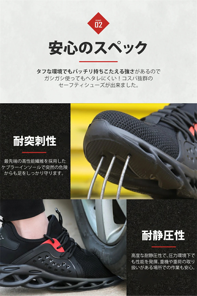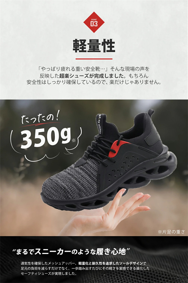 ■Point01 デザイン性 仕事靴に見えないスタイリッシュなデザイン。現場での安全の確保しながら、仕事終わりにそのまま飲みや遊びに行けるのがうれしいポイント。 ■Point02 耐久性 タフな環境でもバッチリ持ちこたえる強さがあるのでガシガシ使ってもヘタレにくい!コスパ抜群のセーフティーシューズが出来ました。 ■Point03 軽量性 「やっぱり疲れる重い安全靴…」そんな現場の声を反映した超楽シューズが完成しました。もちろん安全性はしっかり確保しているので、楽だけじゃありません。 |
