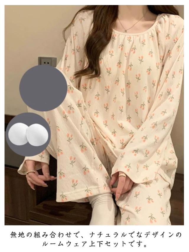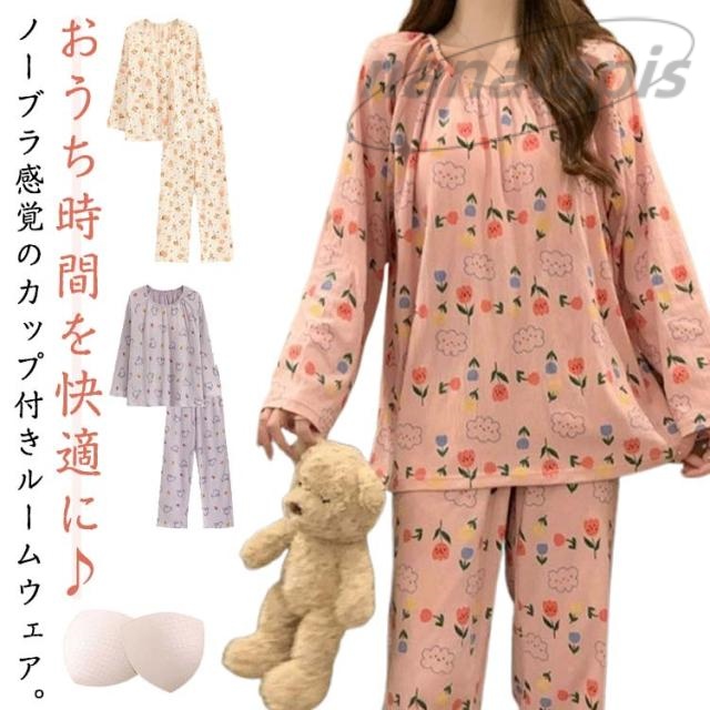 秋 レディース ナイトブラ カップ付き ルームウェア ブラ付き ナイトブラ付き ナイトブラ パジャマ プルオーバー 春 上下セット 部屋着 長袖 ロングパンツ ナイトウェア 寝巻き セットアップ 寝間着 パッド付き