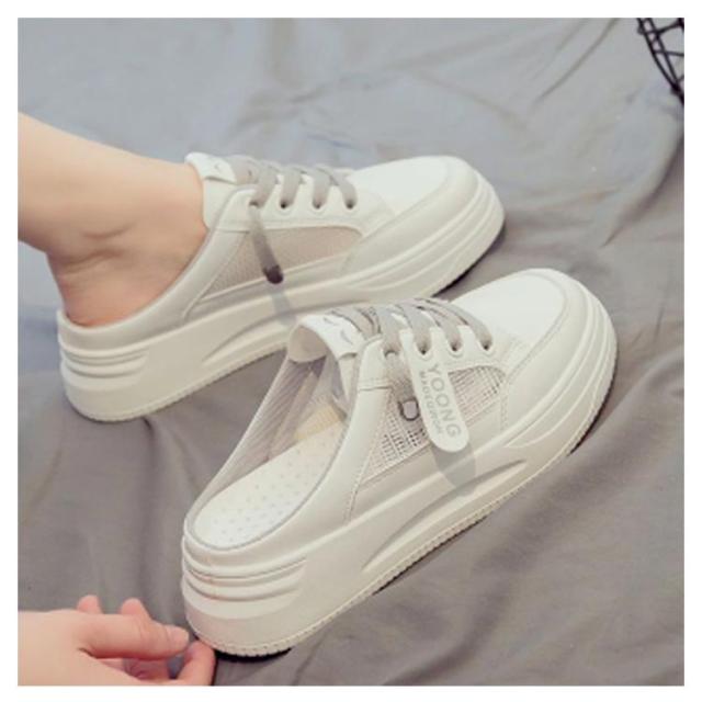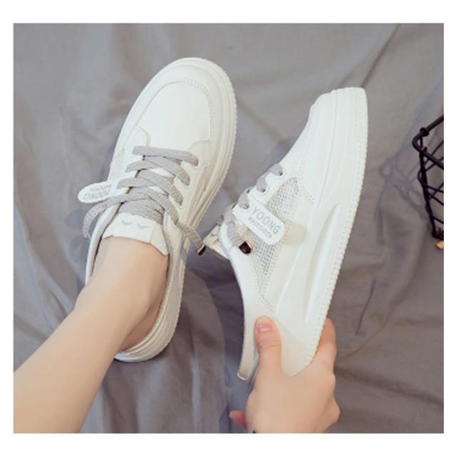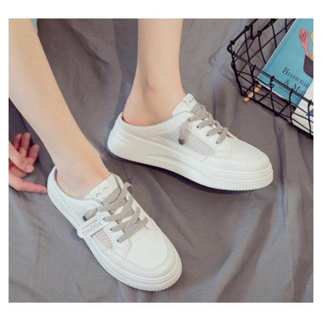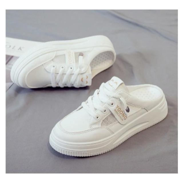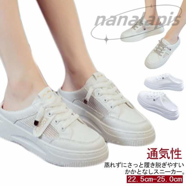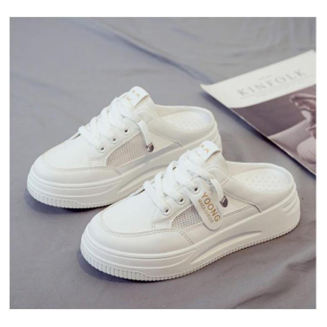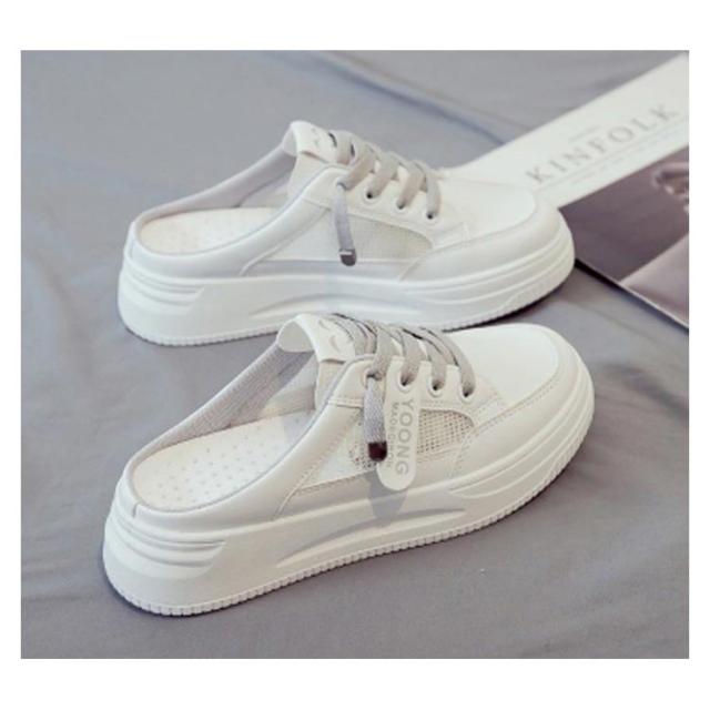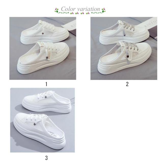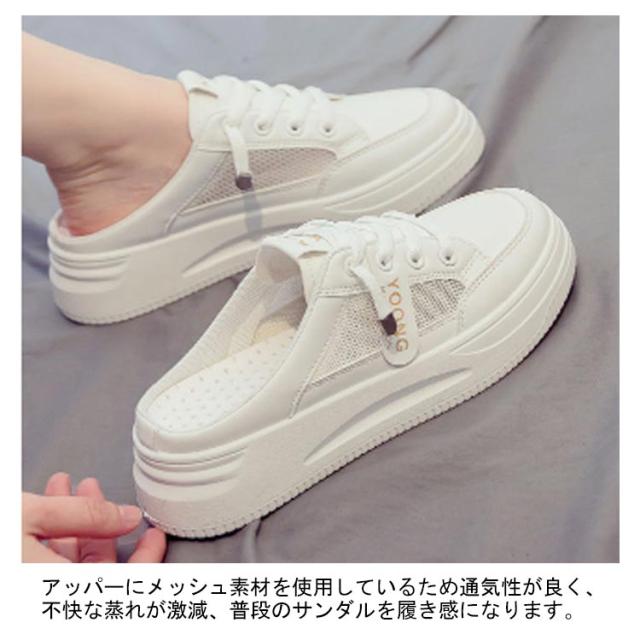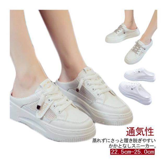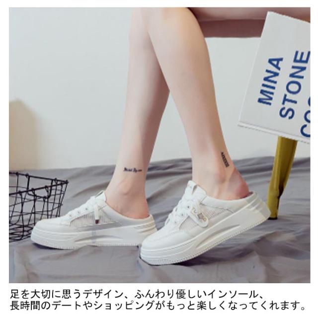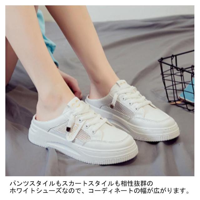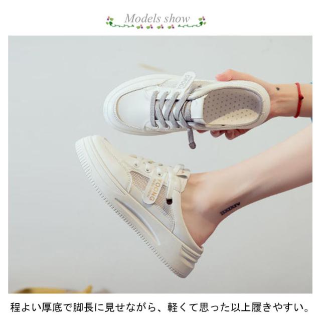 | 蒸れずにさっと履き脱ぎやすいかかとなしスニーカー。 程よい厚底で脚長に見せながら、軽くて思った以上履きやすい。 アッパーにメッシュ素材を使用しているため通気性が良く、不快な蒸れが激減、普段のサンダルを履き感になります。 パンツスタイルもスカートスタイルも相性抜群のホワイトシューズなので、コーディネートの幅が広がります。 足を大切に思うデザイン、ふんわり優しいインソール、長時間のデートやショッピングがもっと楽しくなってくれます。 | |