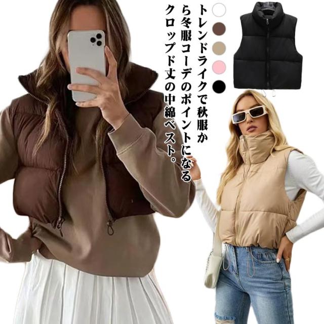 トレンドライクで秋服から冬服コーデのポイントになるクロップド丈の中綿ベスト。