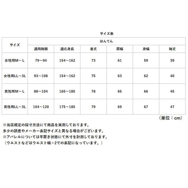 | サイズ | ・女性用M〜L ・女性用LL〜3L ・男性用M〜L ・男性用LL〜3L ※サイズについて詳細は、商品画像の中にあるサイズ表をご覧くださいませ。 |