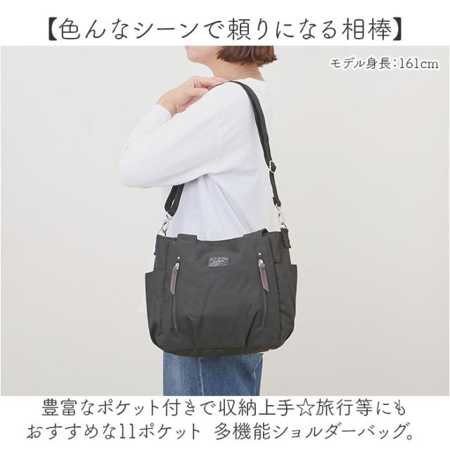 | 商品説明 | 【色んなシーンで頼りになる相棒】 ・豊富なポケット付きで収納上手☆旅行等にもおすすめな11ポケット 多機能ショルダーバッグ。 【軽やかな使い心地でストレスフリー】 ・体に負担がかかりにくい軽量設計。荷物を沢山入れても、重くなりすぎずアクティブに動ける! 【お好みに合わせてスタイルチェンジ】 ・短いハンドルを使ってトート使い。長さ調節可能なショルダーを取り付け、肩掛けや斜め掛けも! 【開閉スムーズ、安心の天ファスナー】 ・ガバっと開いて取り出しやすく、ファスナーを閉じれば中身の飛び出しをガード。 【B5対応でざっくりひとまとめ】 ・B5がすっぽり。程よくマチを設け、ポーチなどお出かけに必要な物を収納できるサイズ感。 【充実の11ポケットで迷子知らず】 ・合計11個のポケットを配置。細々した物もすっきり整頓できて、バッグの中で探す手間が不要。 【お揃いOK☆ユニセックスデザイン】 ・シンプルでラフに持ち歩けるアイテム。性別や年代問わず使えてお揃いやシェアもOK! 【ポケット仕様】 ・内側:ファスナーポケット×1、オープンポケット×2 ・メインルーム前後:オープンポケット×2 ・前面:オープンポケット×1、縦ファスナーポケット×2 ・サイド:オープンポケット×2 ・背面:オープンポケット×1 |