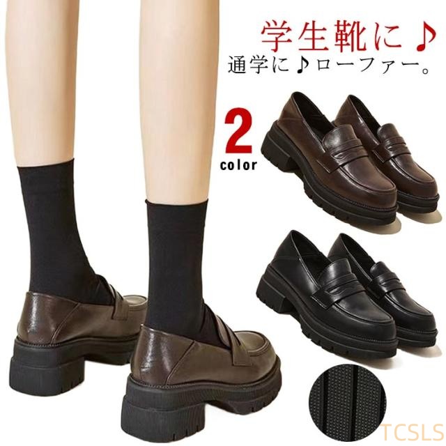 | 学生靴に♪通学に♪ローファー。 約5.5cmヒールでスタイルアップ!約5.5cmのヒールと前底ストームでリーズナブルで美脚&可愛いの絶妙なバランス。 合成皮革素材なので、雨の日にも強く、滑りにくいゴム底で安定感抜群! | |