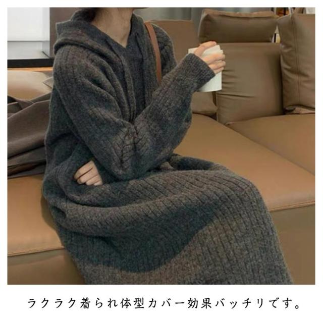 ニット フード付き ゆったり ワンピース 秋 パーカーワンピース 長袖 ミモレ丈ワンピース マキシワンピース 体型カバー 大きいサイズ ニットワンピース 秋冬 冬 30代 40代