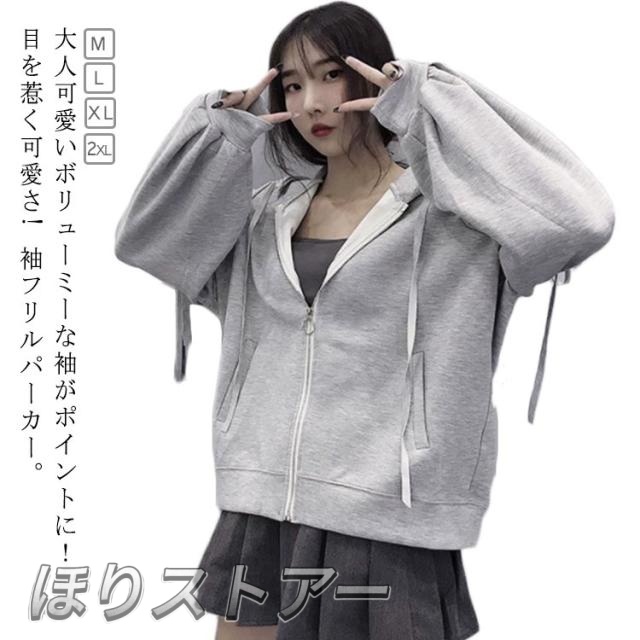 フリルパーカー フード付き ジャケット フリルパーカー スウェット レディース フリル カジュアル 春秋 トップス パーカー ボリュームシルエット 大人可愛い ジャケット エレガント フェミニン グレー 大人可愛い