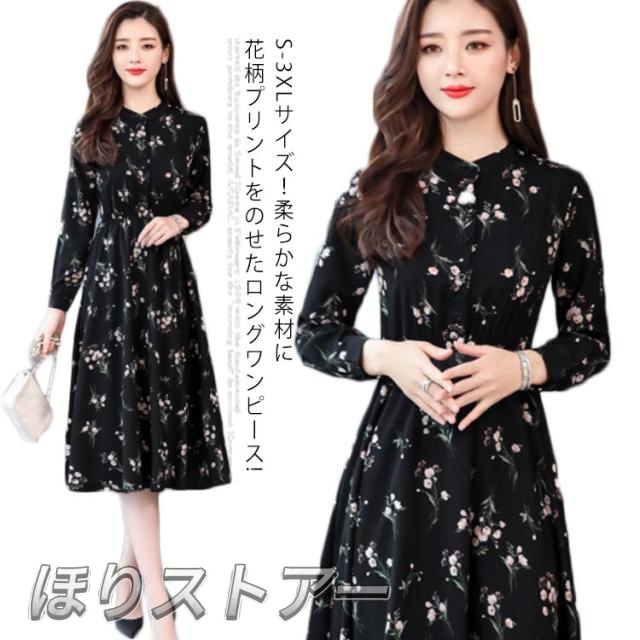花柄ワンピース ロングシャツワンピース ワンピース 花柄 長袖ワンピース プリントワンピース 膝下丈 ロング丈 シャツワンピ aライン フレア 大きサイズ 春 夏 送料無料