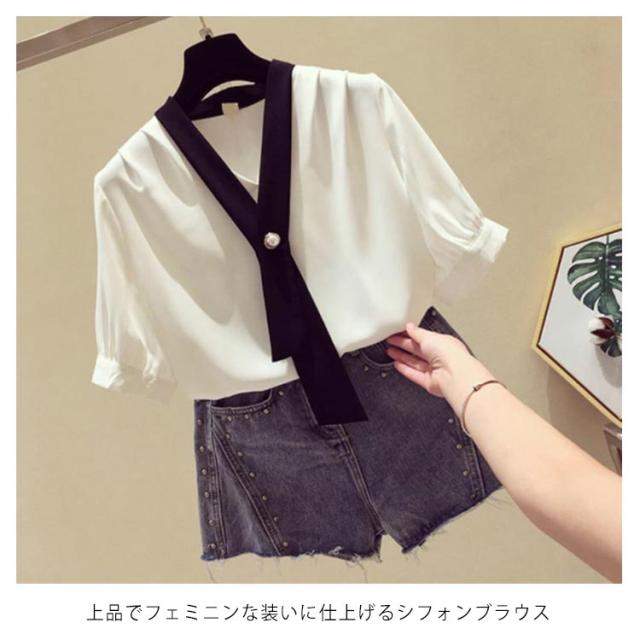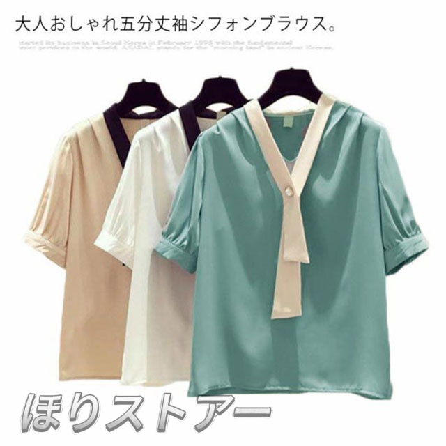 ブラウス レディース シフォンブラウス 五分丈袖ブラウス シャツブラウス プルオーバーブラウス トップス ショート丈 リボン付き ゆったり ルーズ 通勤 エレガント かわいい 夏 送料無料 大きいサイズ オフィス