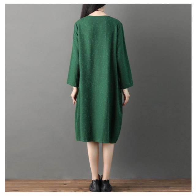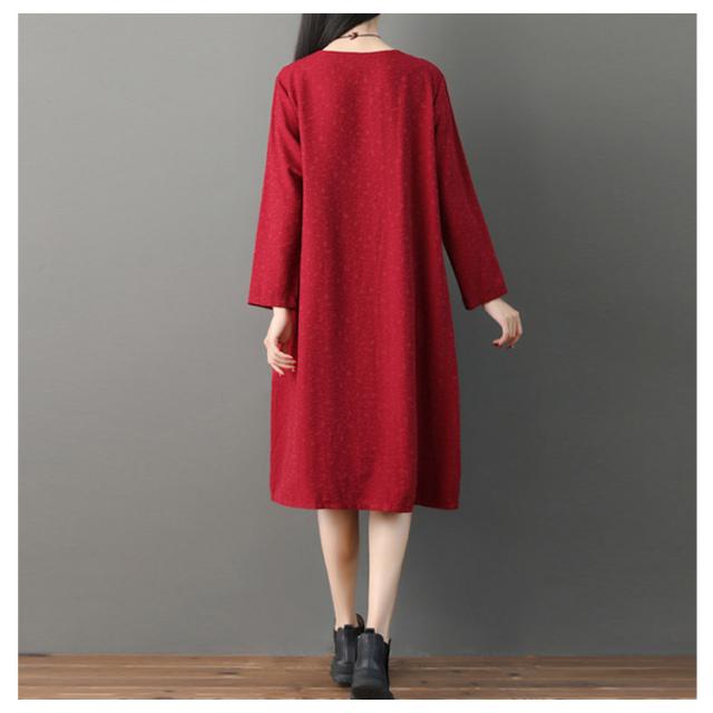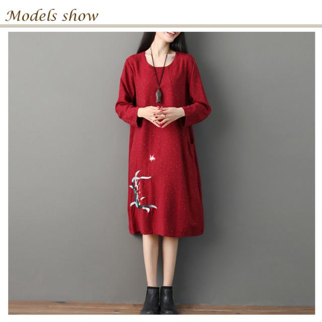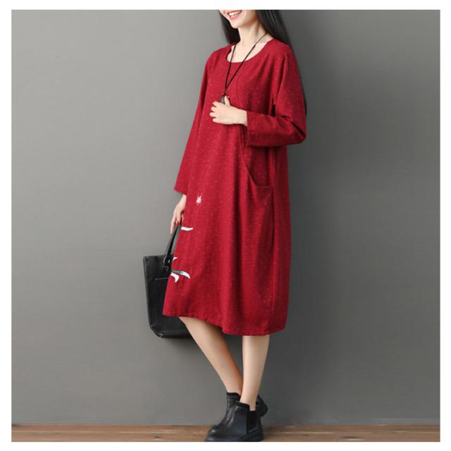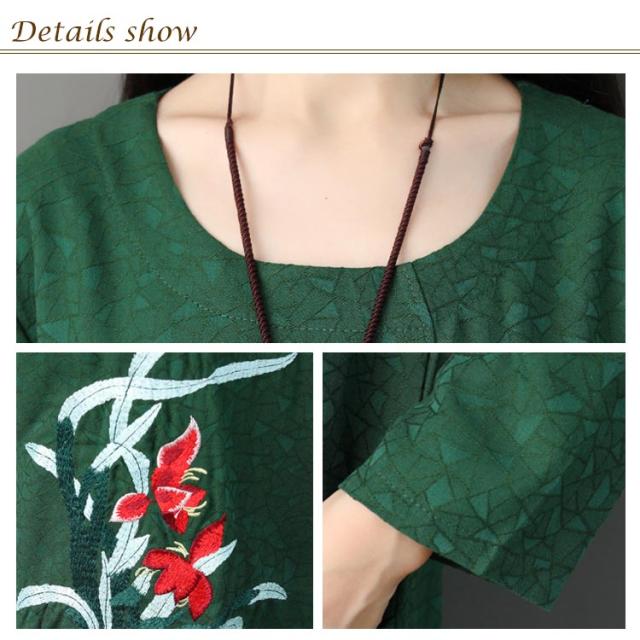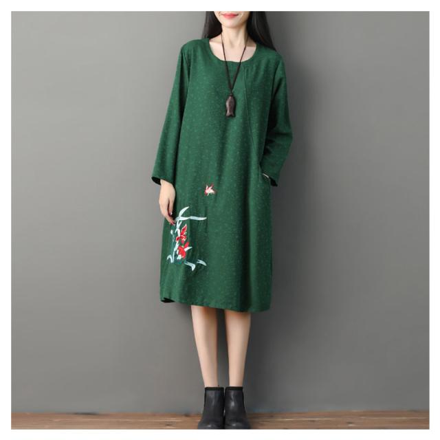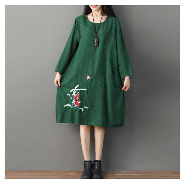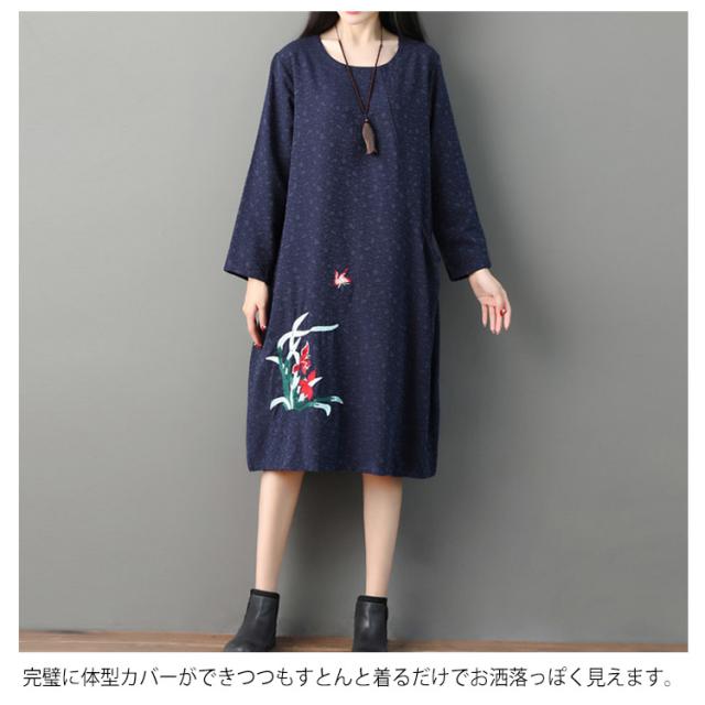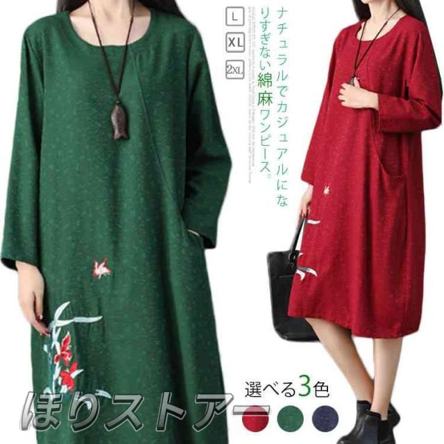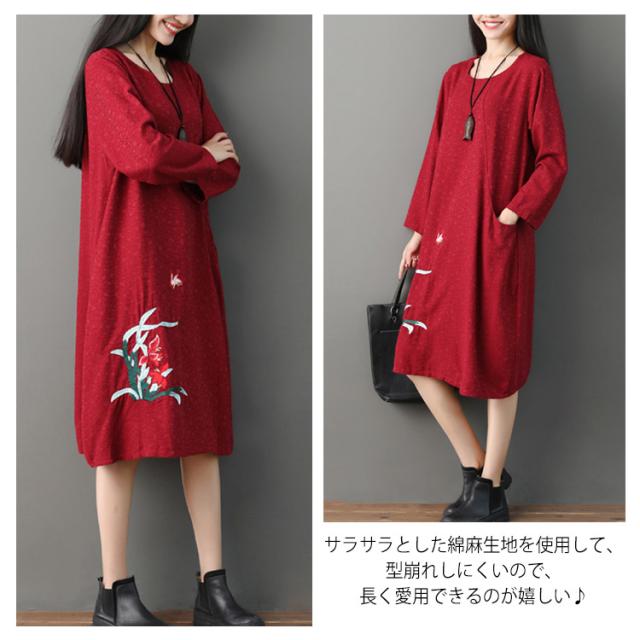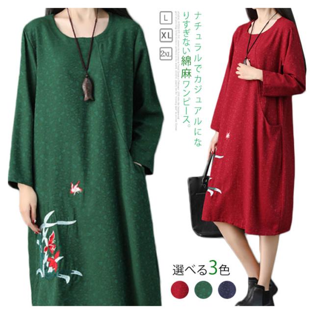 さりげない花柄刺繍入り!春ワンピース レディース エスニック ワンピース Uネック 綿麻ワンピース リネンワンピース ミディアム丈 ミモレ丈 長袖 刺繍入り 春 夏 秋送料無料