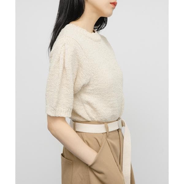 スラブ糸を使用し、表面感のある編地に仕上げたハーフスリーブニット。コンパクトなサイジングはスタイルアップ効果を発揮し、少しボリュームを出した袖もポイントです。合わせるボトムを選ばないので、着回し力のある1着です。