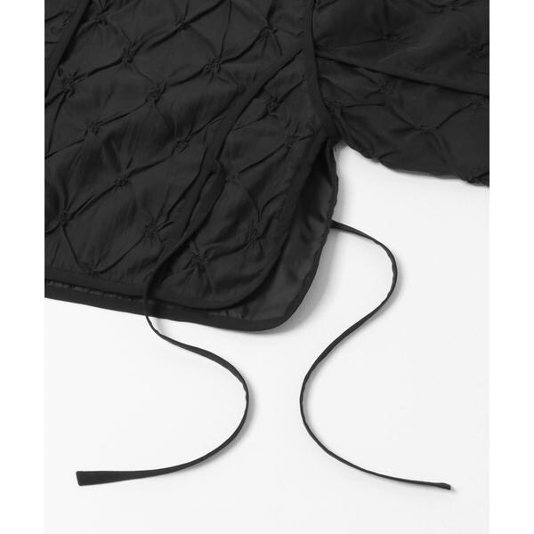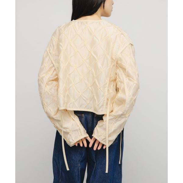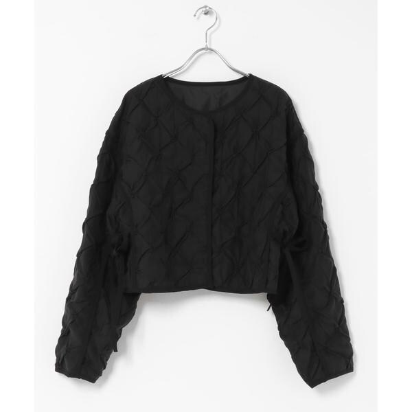 シャーリングデザインが華やかで存在感を放つジャケット。ブラウス感覚で羽織っていただける軽さや、表地の程よく光沢のあるシアー素材もポイントです。パイピング仕様がメリハリを出しているので、ほっこりし過ぎません。裾サイドもスリットが入っており、紐を垂らしたり結んだりと変えていただけます。