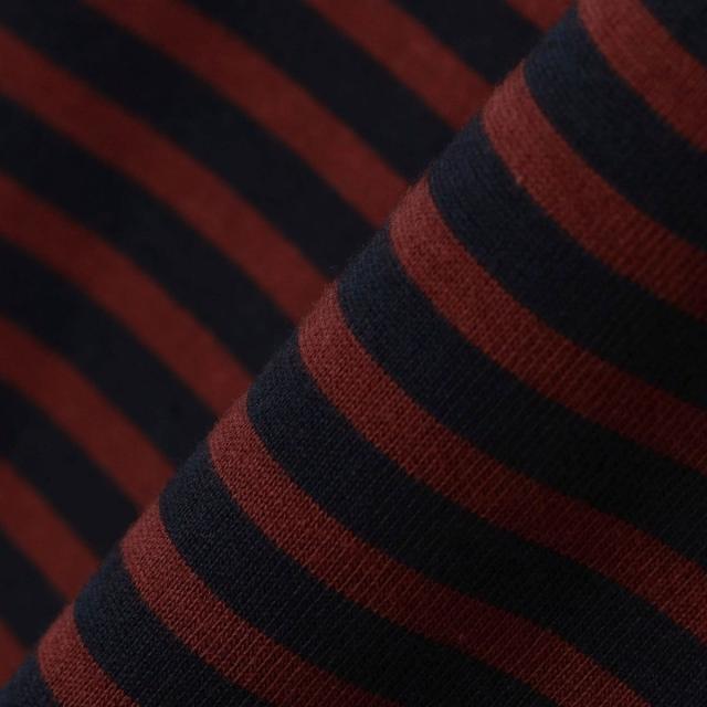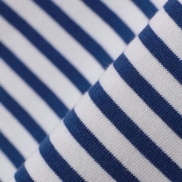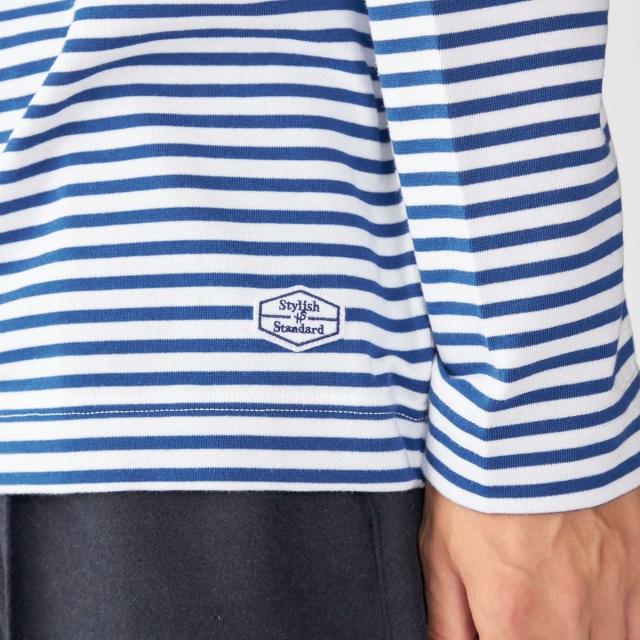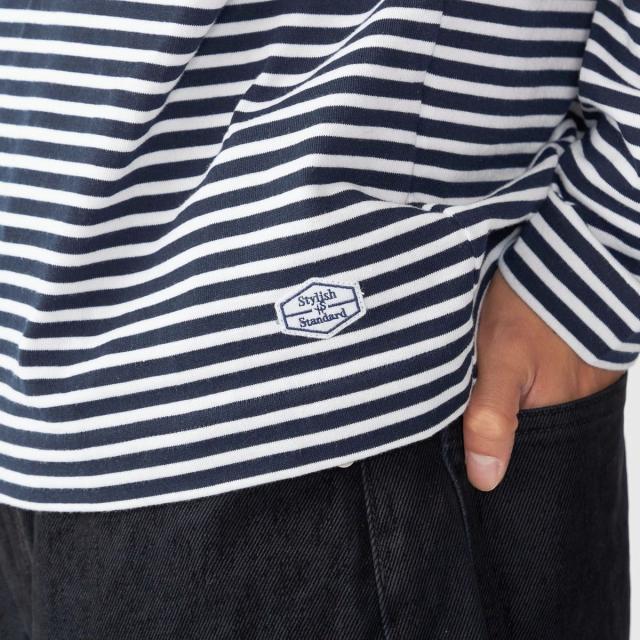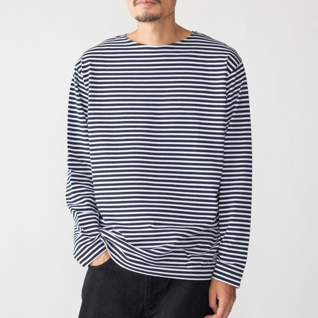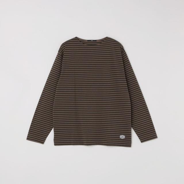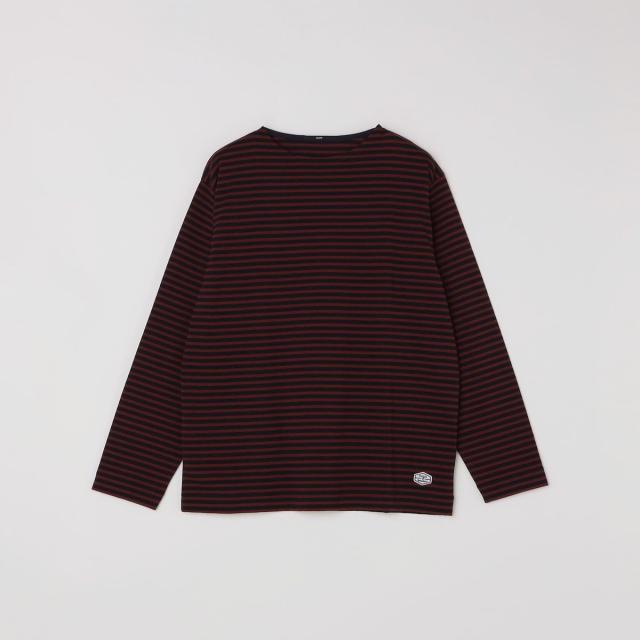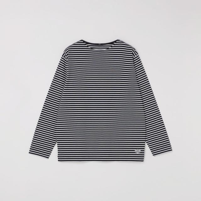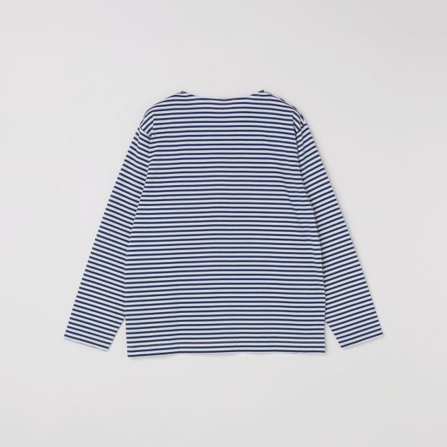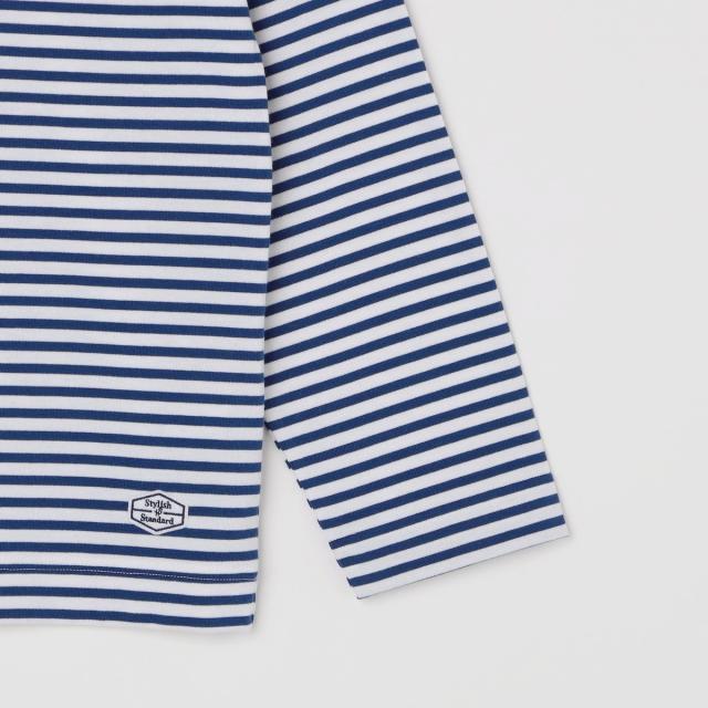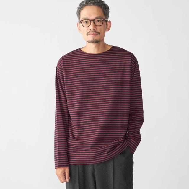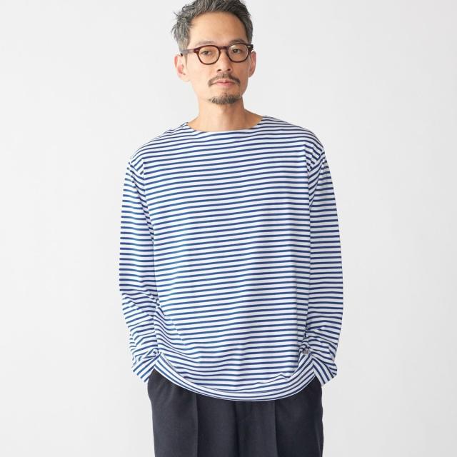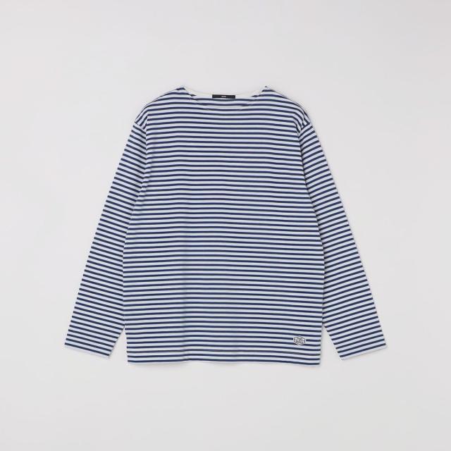 マリンテイスト溢れるバスクボーダー柄で仕上げた、ロゴワッペン入りのボートネックカットソー