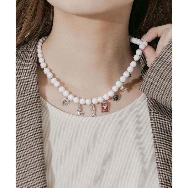 ホワイトのビーズが連なったネックレスに、ハート、マーメイド、コインなど個性的なチャームが加わったデザイン性高いネックレス。