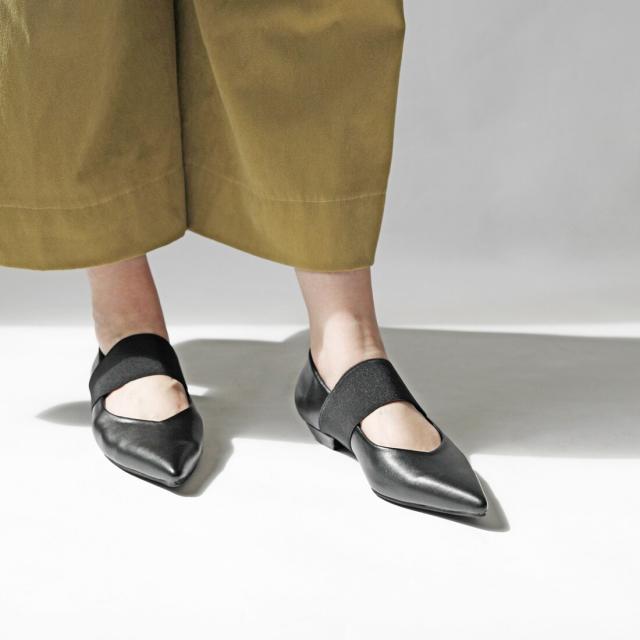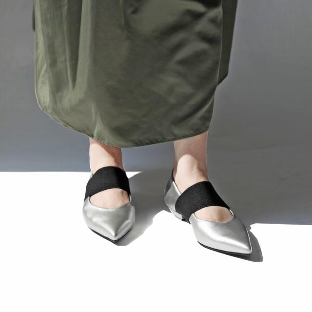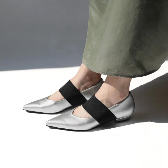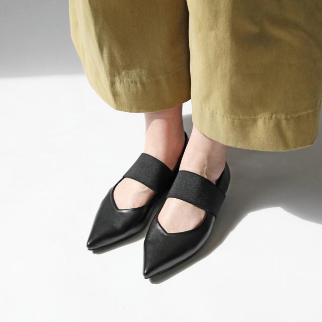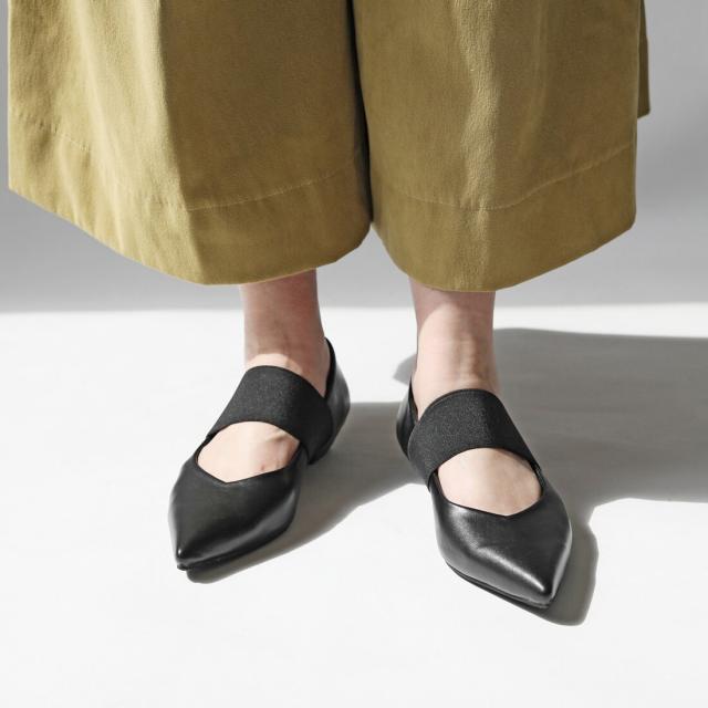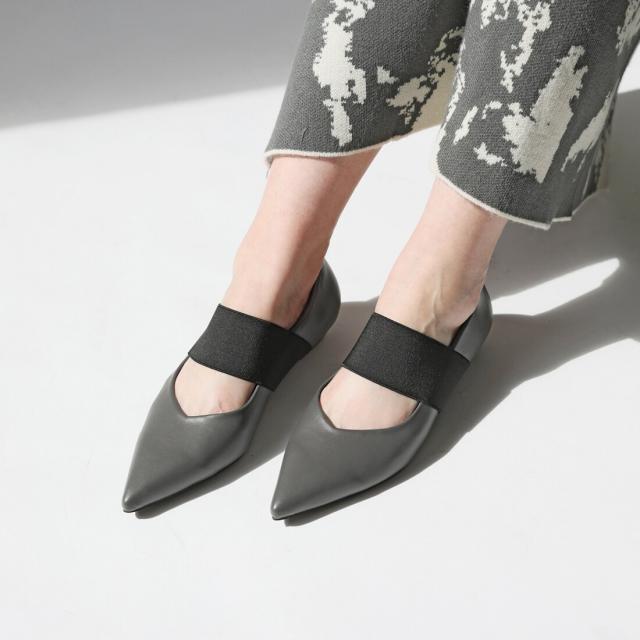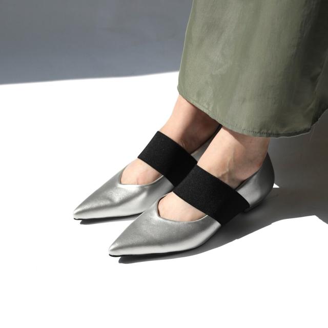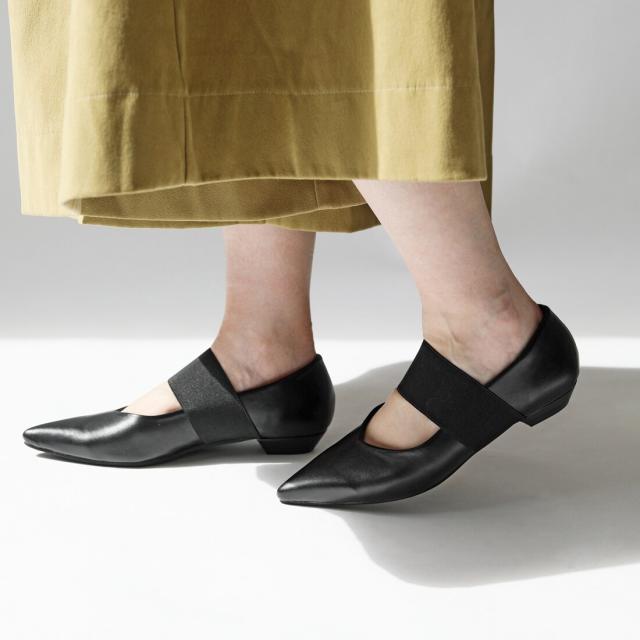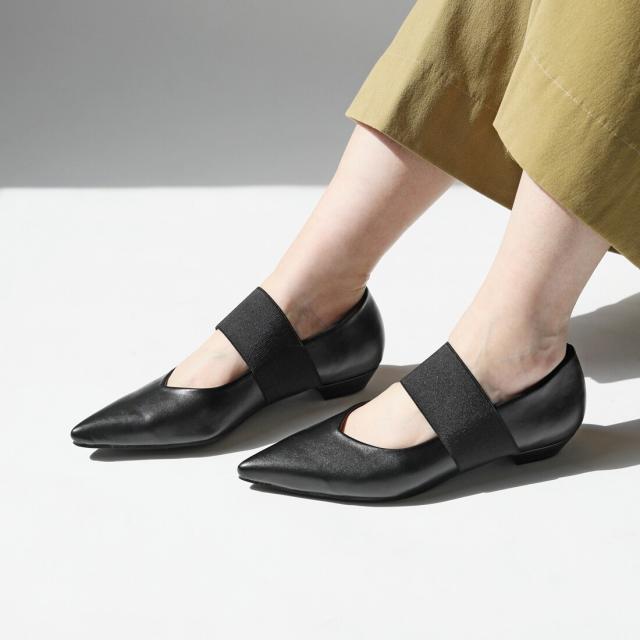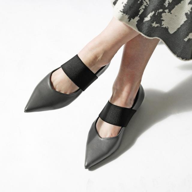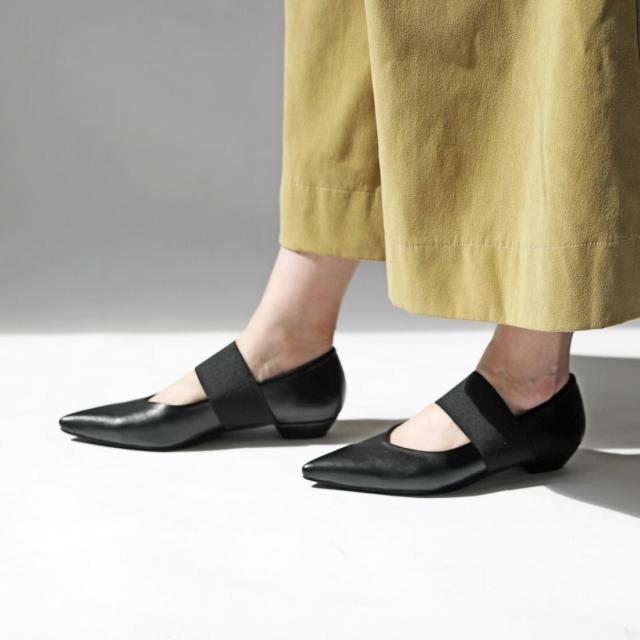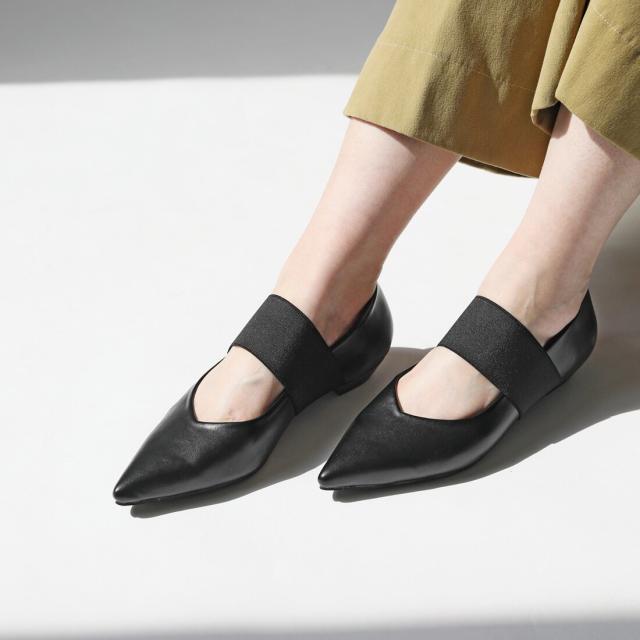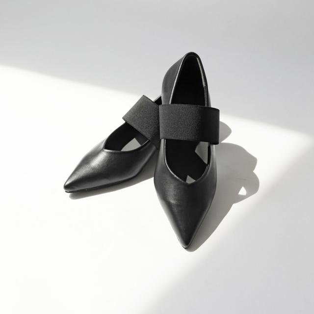足元からポインテッドトゥ×ワイドゴムストラップで、
