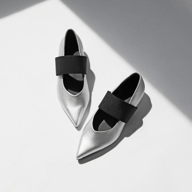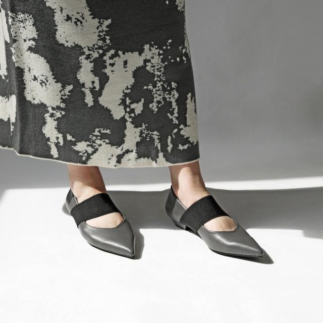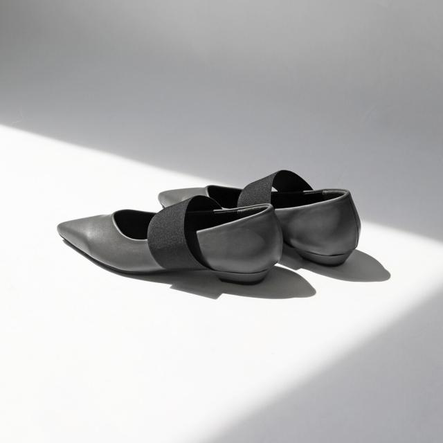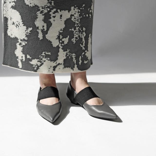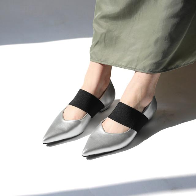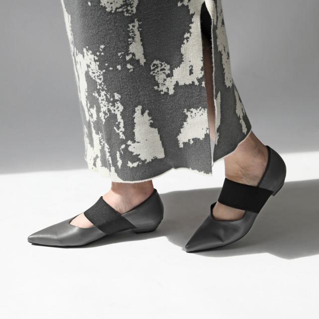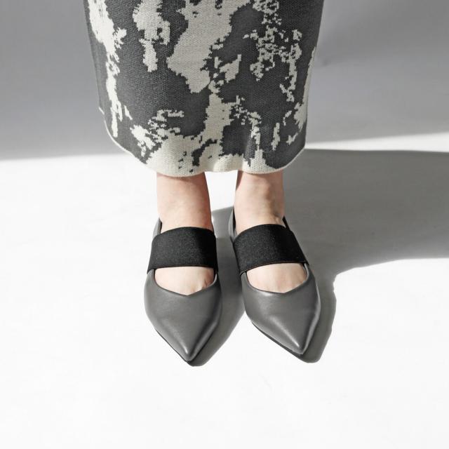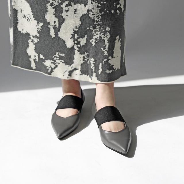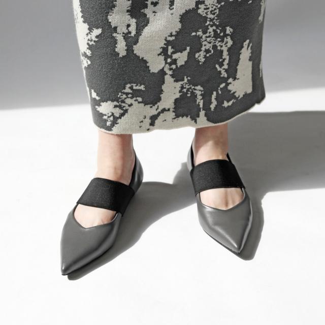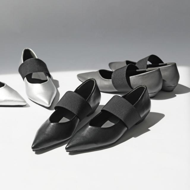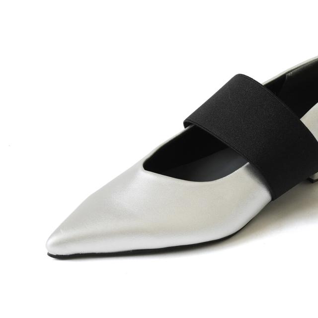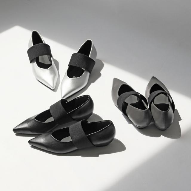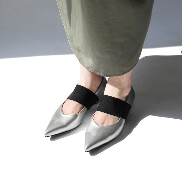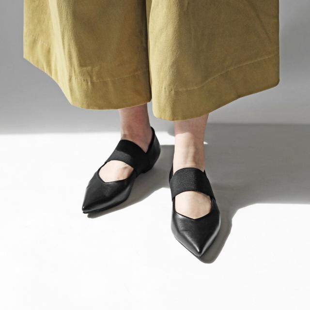 足元からポインテッドトゥ×ワイドゴムストラップで、