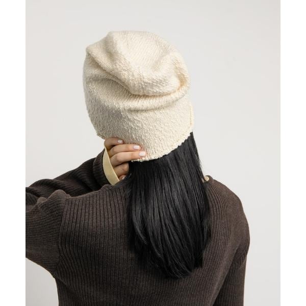 ポコポコと表面感のある糸で編まれたニットビーニー。少し大きめなのでトップをたるませて被ったり、深めに被っていただいたりできます。いつものスタイルに取り入れるだけで旬な印象に仕上がります。
