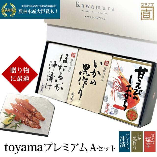 富山湾海洋深層水仕込のマイルドな珍味、プレミアムほたるいか沖漬け、プレミアムいかの黒作り、甘えびの塩辛をセットにした、川村水産 toyamaプレミアム Aです。