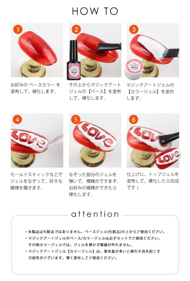 | 注意事項 | ・本製品は化粧品ではありません。ベースジェル(化粧品)の上からご使用ください。 ・マジックアートジェルのベース/カラージェルは必ずセットでご使用ください。 その他カラージェルでは、ジェルを弾かず模様が作れません。 ・マジックアートジェル【カラージェル】は、塗布量が多いと硬化不良を起こす 可能性がございます。薄く塗布してご使用ください。 ・当店取り扱いのUV/LEDライトに対応しています。 ・塗布量や撮影環境、モニターによって、色味の見え方が異なる場合がございます。 |