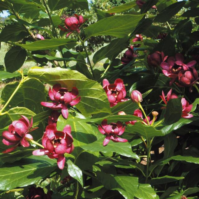 午前中に良い香りを漂わせる花が咲くクロバナロウバイ。次々と開花します。美しい光沢のある葉も魅力!