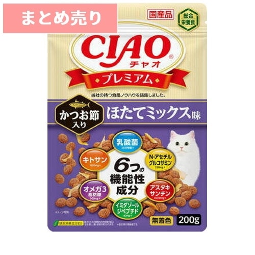 いなば CIAOプレミアム かつお節入り ほたてミックス味 200g 猫 ねこ ネコ キャット cat CAT 猫用 ねこ用 猫フード キャットフード 猫餌 猫えさ きゃっとふーど 総合栄養食 カリカリ お腹 関節 目 皮膚 被毛 健康維持 健康サポート 元気 尿 おしっこ 糞 フン 臭い ニオイ 消臭 乳酸菌 キトサン グルコサミン アスタキサンチン オメガ3 イミダゾールジペプチド かつお節 カツオ節 鰹節 ほたて ホタテ 帆立 ちゃお チャオ 国産 日本産