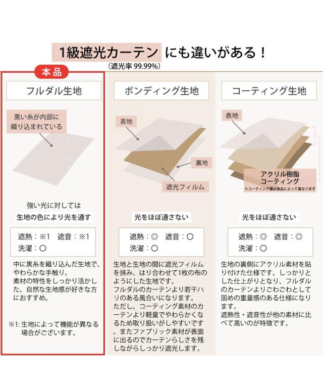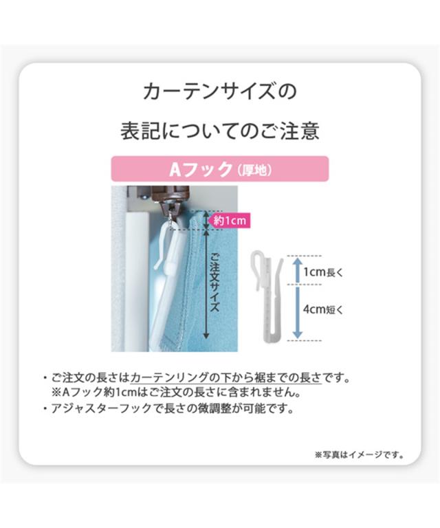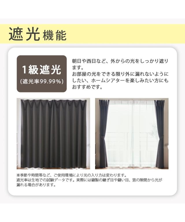 素材:<カーテン>ポリエステル100%、<レースカーテン>ポリエステル100% 遮光:あり 1級遮光(99.99%)(カーテン) 遮熱:なし UVカット:なし 外から見えにくい(遮像):あり 昼間見えにくい(レースカーテン) 防炎:なし 防音・遮音:なし 形態安定加工:あり(カーテン) 消臭:なし 採光:なし 花粉キャッチ:なし 防カビ:なし 抗カビ:なし はっ水:なし お届け枚数:カーテン2枚・レースカーテン2枚の計4枚セット タッセル:あり(共生地) アジャスターフック:あり フックタイプ:カーテン・レースカーテンとも:カーテンレールが見えるタイプ=Aフック ※サイズ表記に記載されている長さは、厚地カーテンの「フックを引っかける部分(カーテンレー
