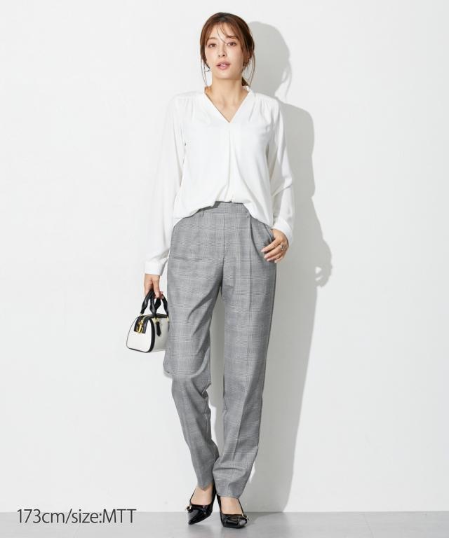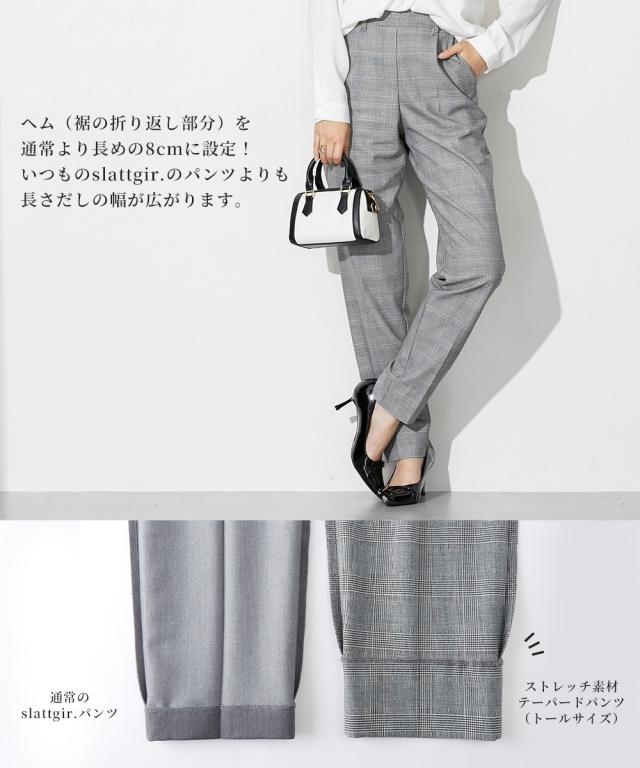 【高身長の方向け・丈長め】ジャストサイズではけるきれいめテーパードパンツの登場■デザイン高身長さん向け設計で、丈長め&股上深めのテーパードシルエット腰回りの寸法、ひざ位置など高身長女性向けのこだわりのサイズ設計ヘム部分(裾の折り返し部分)を通常のパンツより長めにとっているので、ぴったりのジャストサイズにお直し可能です!■素材きれい見えするレーヨン混素材、ストレッチ素材でどんな動きもラクラク ■おすすめのスタイリング同素材のジャケットとの組み合わせがおすすめ!ブラウス・シャツを合わせたきれいめオフィススタイルや、ニットやカットソーを合わせたカジュアルスタイルなどON・OFF問わず大活躍間違いナシです