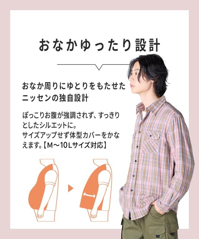 ふんわりソフトな風合いで、素肌にやさしい綿100%ダブルガーゼ素材のチェックシャツ。お腹まわりにゆとりをもたせた独自設計で、気になる体型をカバーします。大きいサイズも展開しております。(M/L/LL/3L/4L/5L/6L/8L/10Lサイズ)■デザインバリエーション豊富な柄展開でボトムを選ばず着回し出来ます。お腹まわりにゆとりを持たせたこだわりの設計で、『首回り・着丈・袖丈はジャストサイズなのにお腹まわりが少し窮屈・・』と言うお悩みにも解決!1サイズ上げる事なくスッキリ着こなせます。前身頃と後身頃をつなぐ箇所は補強のためのパーツ(ガゼット仕様)を施しております。ボタンの付け糸はクロス付けで、とれにくくなっております。■素材肌に優しい綿100%ダブルガーゼ素材で洗うほどに柔らかくなじみ着心地 程よい厚みの素材感で長いシーズン着用可能です。■おすすめのおしゃれスタイリングボトムを選ばないカラーでコーディネートしやすいのが特徴です。