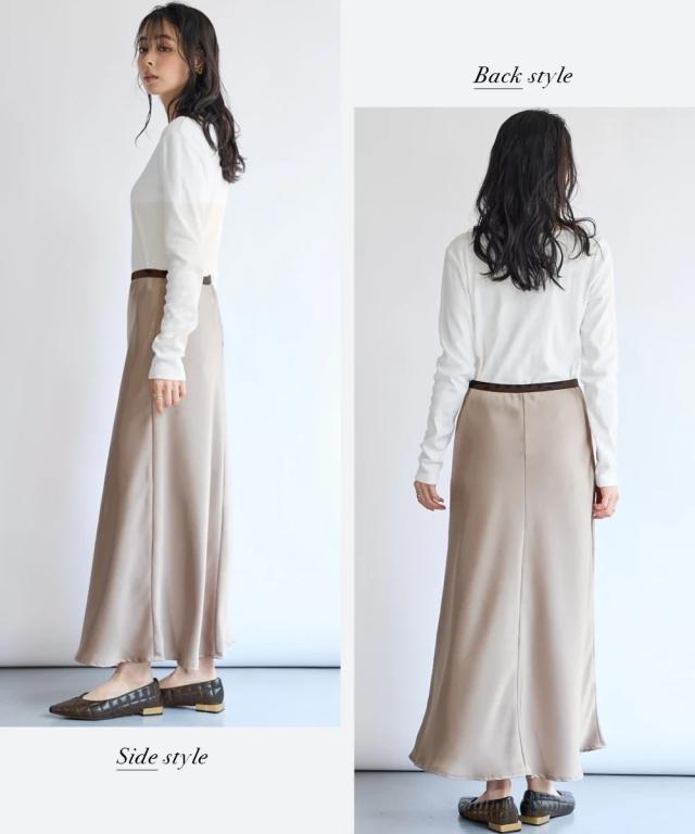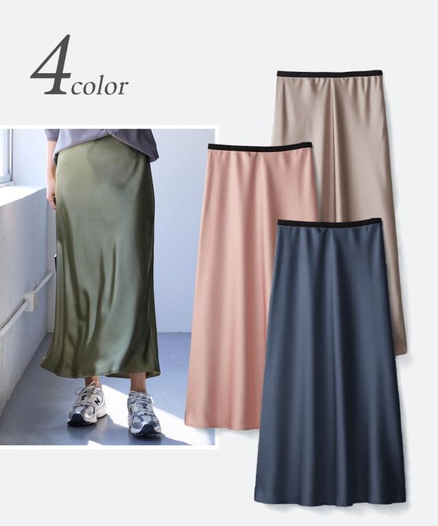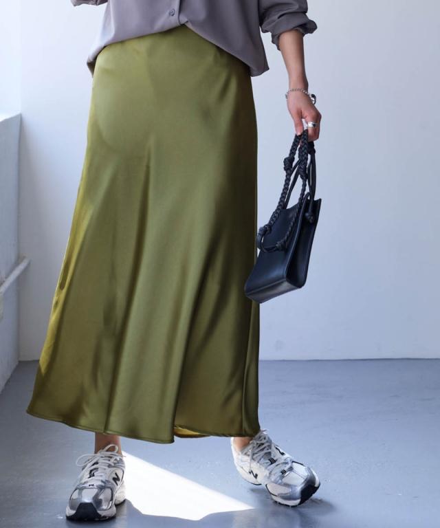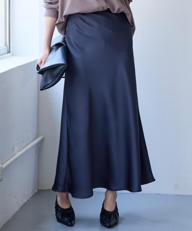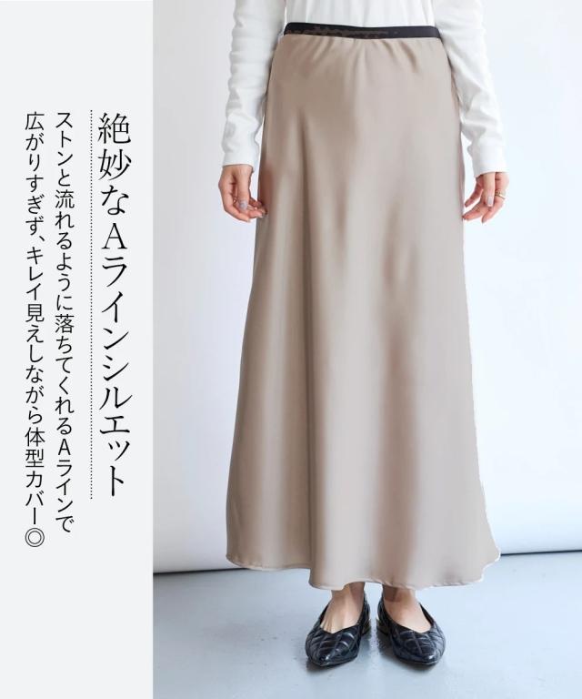 上品な光沢感となめらかな風合いが特徴のサテンスカート■デザインギラギラしすぎない上品な光沢感。シンプルで流行りに左右されないゆったりデザイン。デイリーはもちろんオフィスやオケージョンまで対応できる優秀スカート。シンプルだからこそ綺麗に着用できるシルエットにこだわりました。サテンの特徴である落ち感が綺麗なシルエットに。広がりすぎず、綺麗なAラインシルエット。ウエストは細ゴム仕様。楽に着用できるだけでなく、サテンの艶感を残すためにおなか周りにギャザーを作らないよう設計しました。サテンのイメージを覆す新感覚サテンです。■素材程よい厚めの生地を採用。上品な光沢感がありなめらかな風合いです。防しわ機能付きなのでシワになりにくく、気軽に着用いただけます。■おすすめのスタイリング上下セットアップで着用可能。オケージョンにもぴったり。