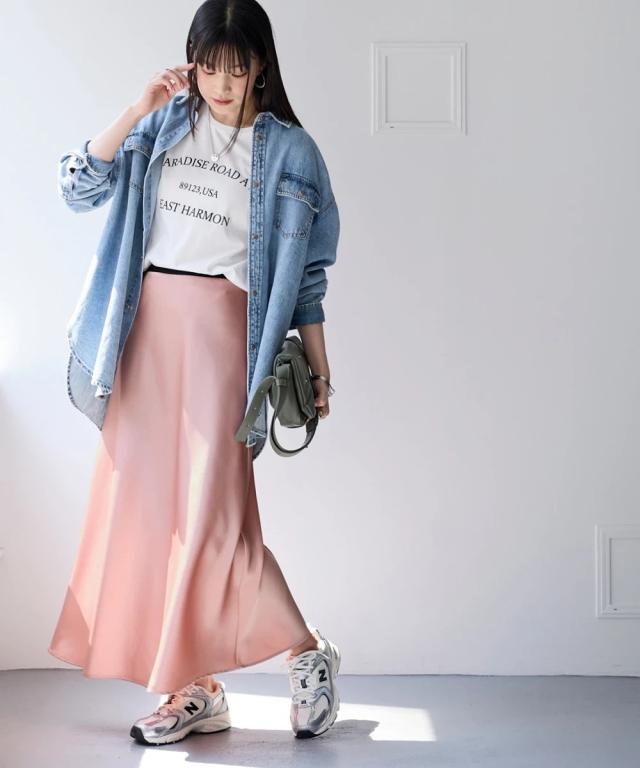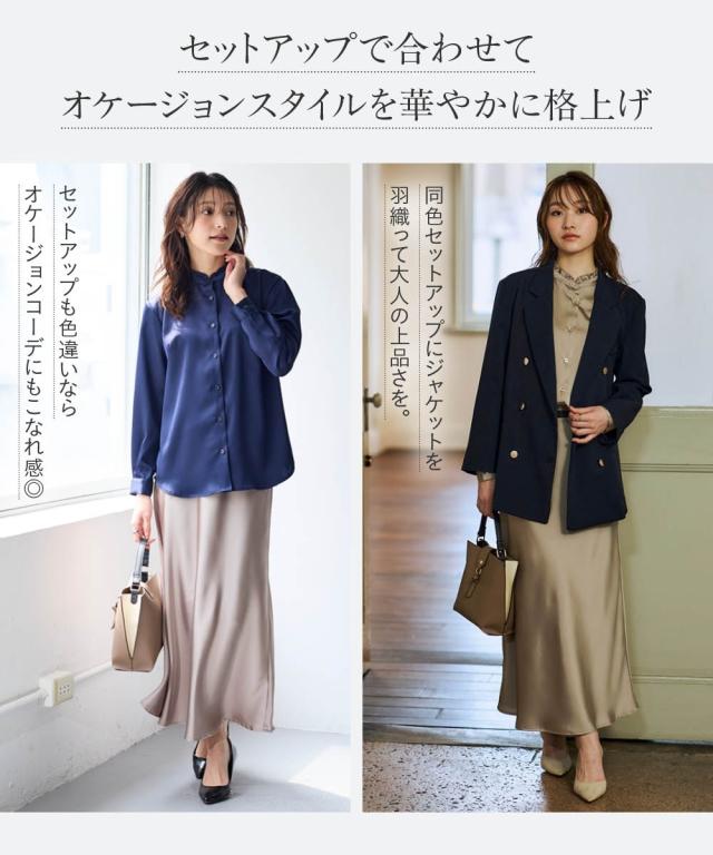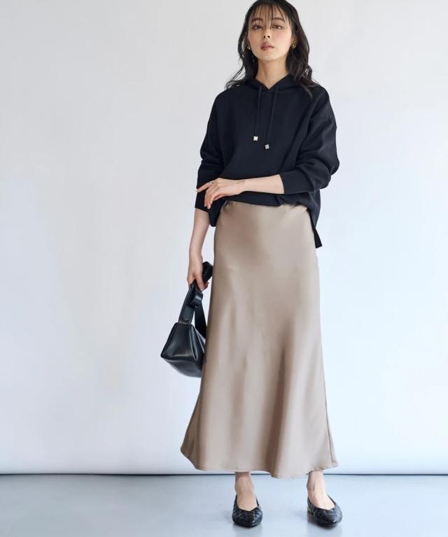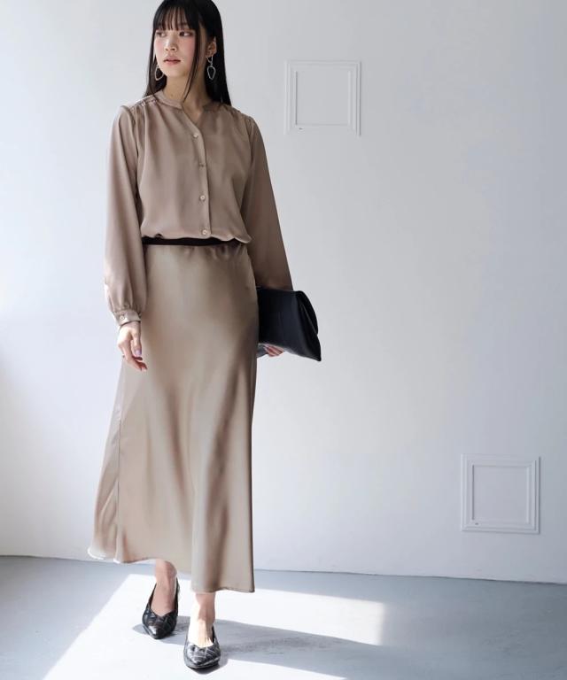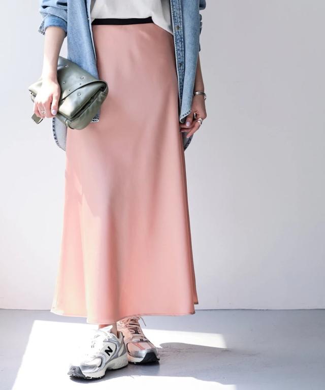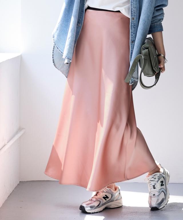 上品な光沢感となめらかな風合いが特徴のサテンスカート■デザインギラギラしすぎない上品な光沢感。シンプルで流行りに左右されないゆったりデザイン。デイリーはもちろんオフィスやオケージョンまで対応できる優秀スカート。シンプルだからこそ綺麗に着用できるシルエットにこだわりました。サテンの特徴である落ち感が綺麗なシルエットに。広がりすぎず、綺麗なAラインシルエット。ウエストは細ゴム仕様。楽に着用できるだけでなく、サテンの艶感を残すためにおなか周りにギャザーを作らないよう設計しました。サテンのイメージを覆す新感覚サテンです。■素材程よい厚めの生地を採用。上品な光沢感がありなめらかな風合いです。防しわ機能付きなのでシワになりにくく、気軽に着用いただけます。■おすすめのスタイリング上下セットアップで着用可能。オケージョンにもぴったり。