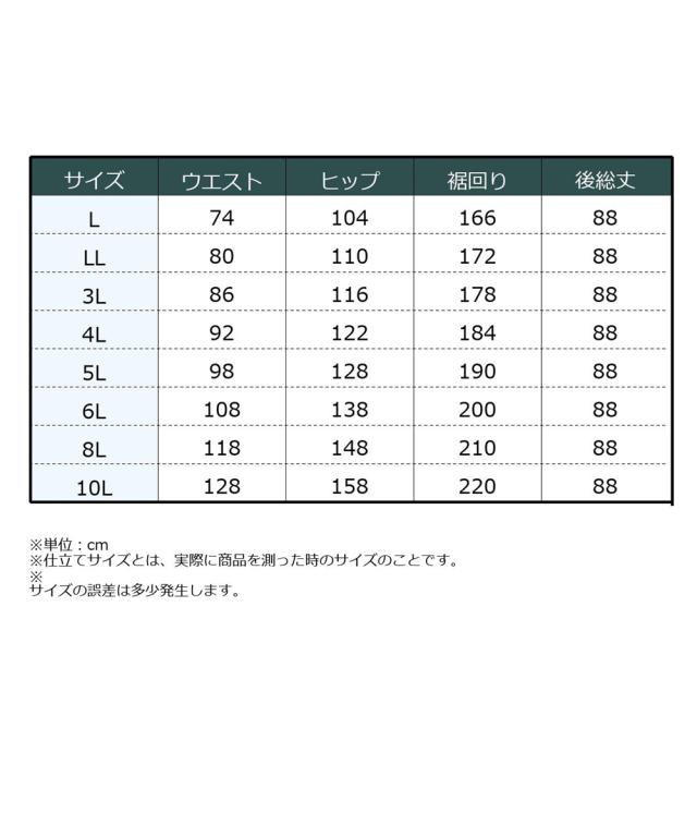 品質=ポリエステル100% ウエスト総ゴム入 透け感:なし 伸縮性:なし 生地の厚み:普通 光沢感:あり 季節:春・秋 シルエット:普通 原産国:中国製 備考:洗濯機OK ネット使用 ※単位:cm ※仕立てサイズとは、実際に商品を測った時のサイズのことです。 ※サイズの誤差は多少発生します。