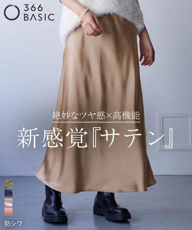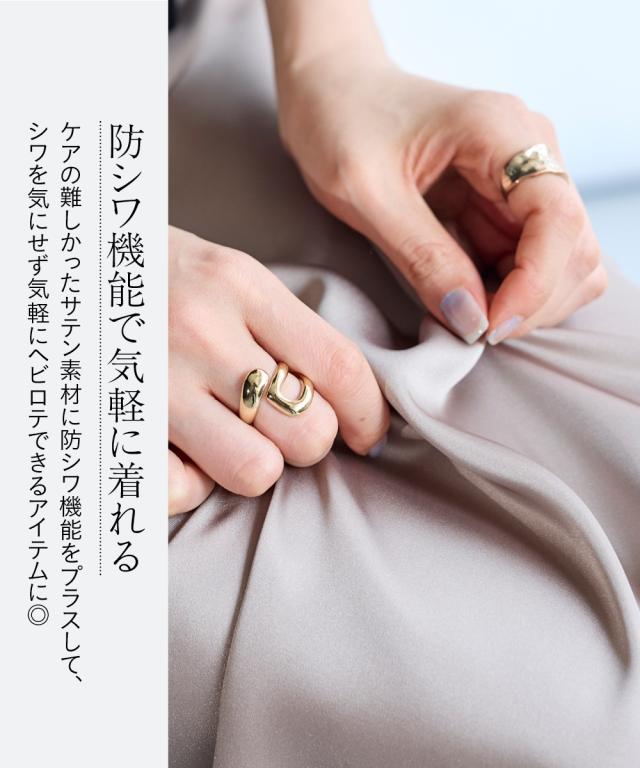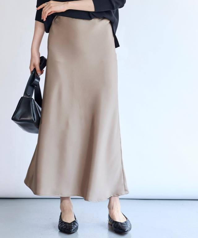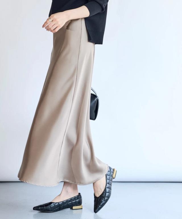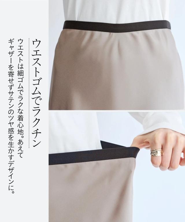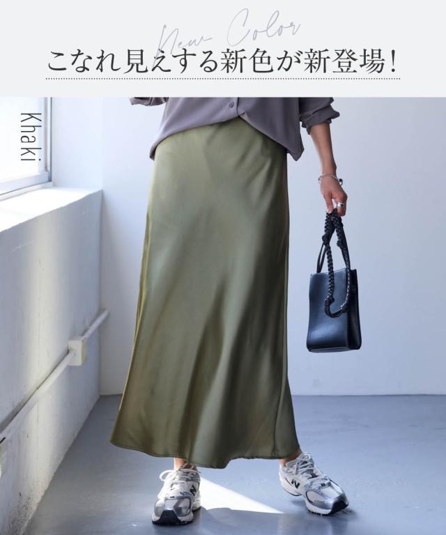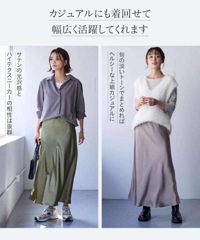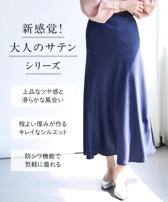 上品な光沢感となめらかな風合いが特徴のサテンスカート■デザインギラギラしすぎない上品な光沢感。シンプルで流行りに左右されないゆったりデザイン。デイリーはもちろんオフィスやオケージョンまで対応できる優秀スカート。シンプルだからこそ綺麗に着用できるシルエットにこだわりました。サテンの特徴である落ち感が綺麗なシルエットに。広がりすぎず、綺麗なAラインシルエット。ウエストは細ゴム仕様。楽に着用できるだけでなく、サテンの艶感を残すためにおなか周りにギャザーを作らないよう設計しました。サテンのイメージを覆す新感覚サテンです。■素材程よい厚めの生地を採用。上品な光沢感がありなめらかな風合いです。防しわ機能付きなのでシワになりにくく、気軽に着用いただけます。■おすすめのスタイリング上下セットアップで着用可能。オケージョンにもぴったり。
