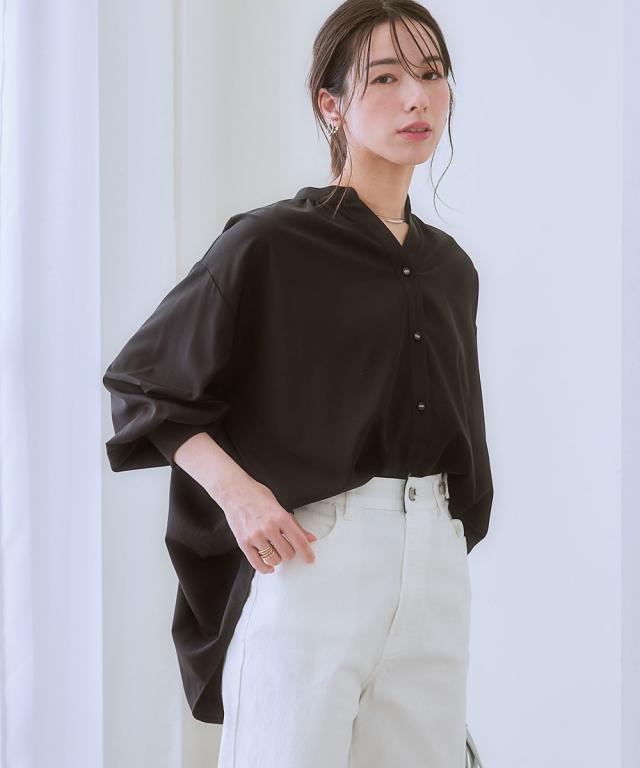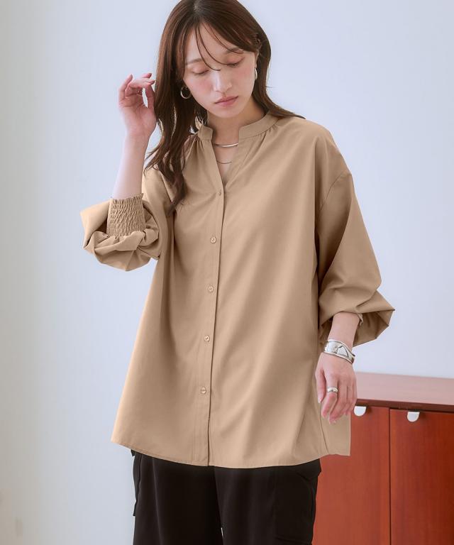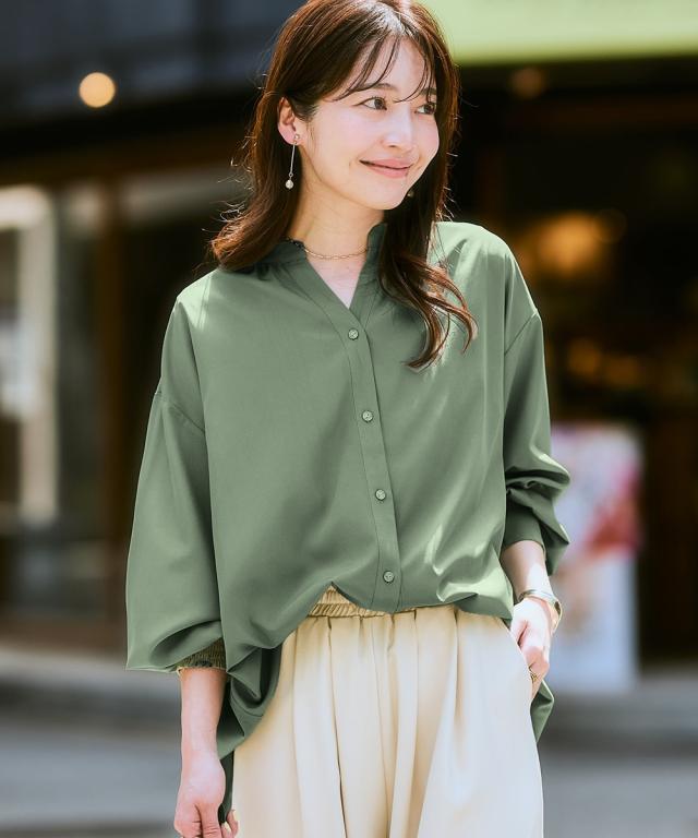 【とろみ素材】バックシャーリングスキッパーシャツ(防シワ・吸汗速乾)