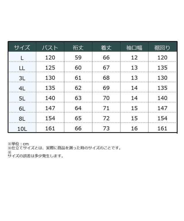 品質:品質=ポリエステル100% [裏地]有(総裏) 襟・袖口周りゴム入 柄の出方が多少異なる場合があります。 透け感:透けにくい 伸縮性:なし 生地の厚み:普通 光沢感:なし 裏地:あり ポケット:なし 季節:春・夏・秋 シルエット:ゆったり 原産国:中国製 備考:洗濯機OK ネット使用 ※単位:cm ※仕立てサイズとは、実際に商品を測った時のサイズのことです。 ※サイズの誤差は多少発生します。