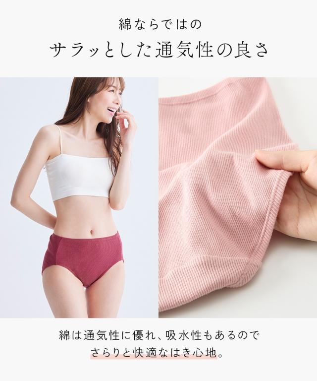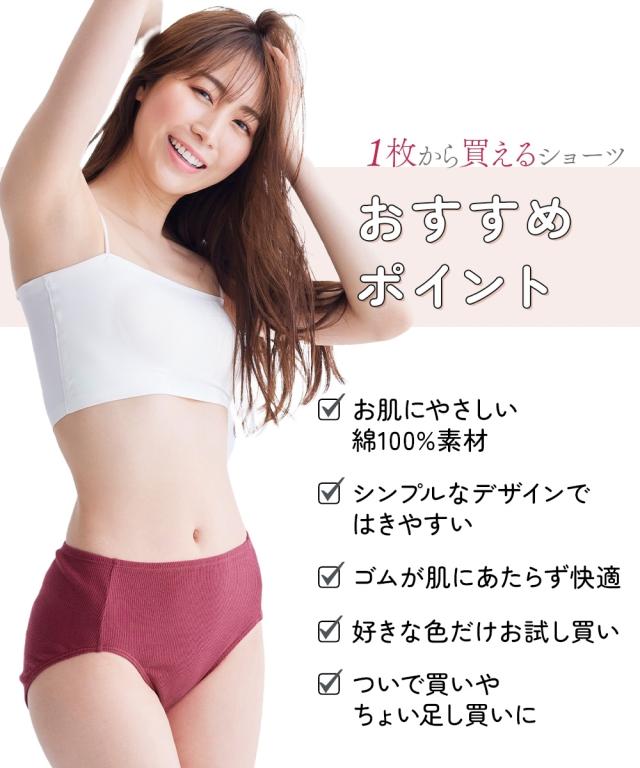 ●綿100%リブ ゴムが肌側にあたらない深ばき丈ショーツ【1枚から買える!】●お客様のご要望にお応えして1枚から買える!綿100%ショーツ◇◆◇おすすめポイント◇◆◇・お肌にやさしい綿100%素材・シンプルなデザインではきやすい・ゴムが肌にあたらず快適・好きな色だけお試し買い・ついで買いやちょい足し買いに■天然素材 コットン100%下着の刺激やムレが気になる方に。体のデリケートな部分に直接触れるショーツだからこそ、通気性良く肌ざわりのやさしい綿100%をおすすめします。■綿ならではのサラッとした通気性の良さ綿は通気性に優れ、吸湿性もあるのでさらりと快適なはき心地が特徴。ムレやすいデリケートな部分だからこそ、肌ざわりにこだわった天然素材をおすすめします。■やわらかさが心地いい『リブ素材』体の動きに合わせたソフトな横伸びで、やさしくフィットします。■ゴムが肌にあたらず快適ウエスト・脚口はゴムを身生地でくるんであるから直接肌にあたらない。締め付けが気になる方や敏感な方にもオススメ■チクチクしないプリントネーム洗濯表示がプリントなので、チクチク感が気にならず快適です■クロッチ裏も綿100%でさらに肌ざわりやさしくクロ