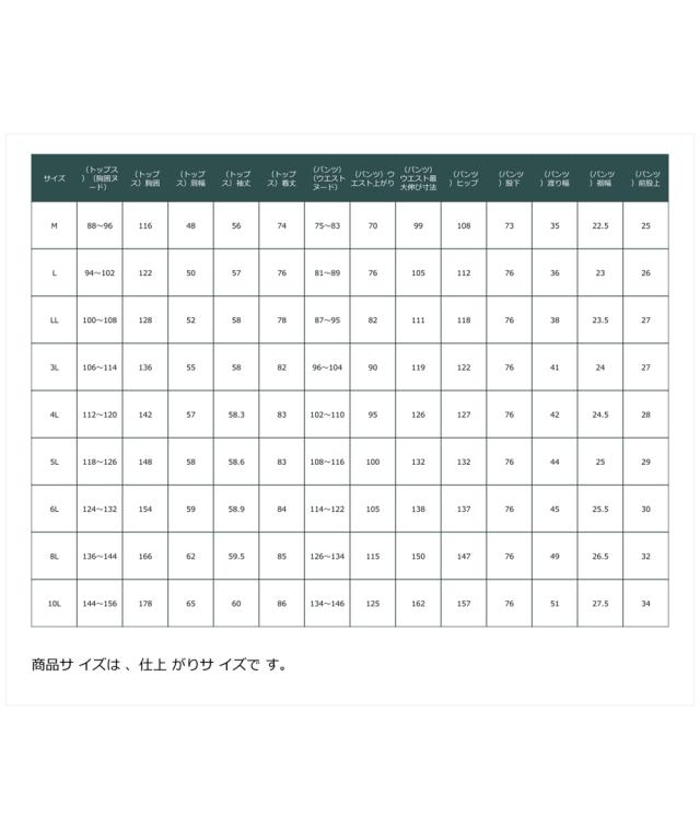 品質:綿80%・ポリエステル15%・レーヨン5% ※柄の出方が多少異なる場合があります。 透け感:なし 伸縮性:なし 生地の厚み:普通 光沢感:なし ポケット:あり(胸1・パンツ後1) ウエスト:総ゴム 前開き:なし 季節:オールシーズン シルエット:普通 原産国:中国製 備考:洗濯機OK ネット使用 ※商品サイズは、仕上がりサイズです。