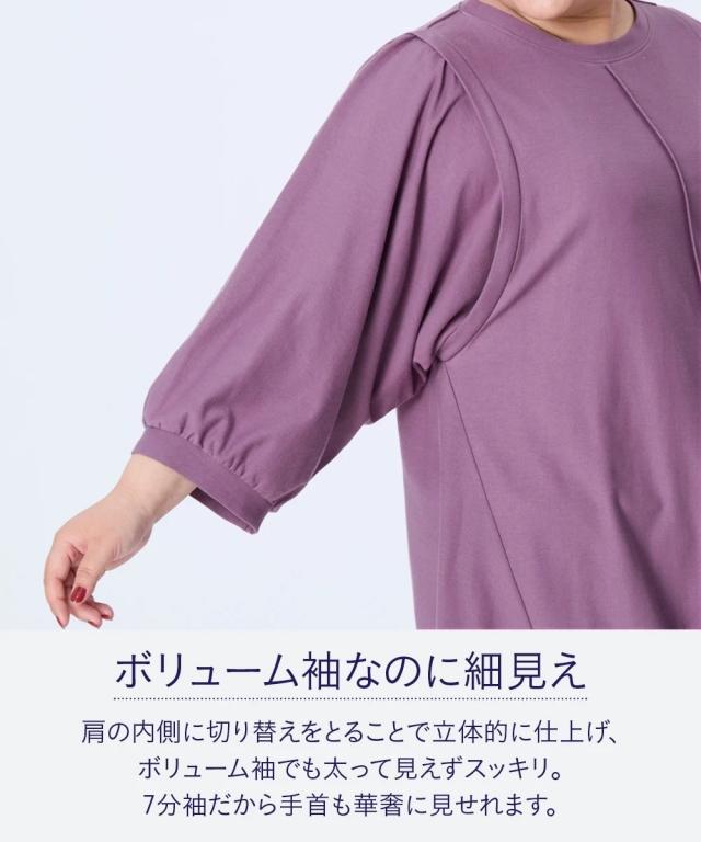体型カバー、細く見えることにこだわって作った商品です。お試しください!■デザイン肩より内側に切り替えをいれて肩風にすることで華奢見えに。フロントの切り替えたライン&脇から切り替えた斜めラインでさらにスッキリ見えます。太い袖でもスッキリ見せてくれる効果があります。さらにきれいなフレアシルエットでふんわり下半身をカバーしてくれます。袖がバルーンシルエット&七分袖で太い袖から手首がでるので視覚効果で華奢見えに。■素材布帛見えするツイル目の上品な素材です。きれいに見えるのに伸縮性があって楽々。ほどよいハリ感で体にはりつきにくく体型をひろいにくいのでスッキリ見せてくれます。抗菌防臭付きで汗をかいても安心です■コーディネートお手持ちのボトムに合わせるだけできまって便利。寒くなってきたら中にハイネックやタートルを合わせてもかわいいので長く使えて便利。