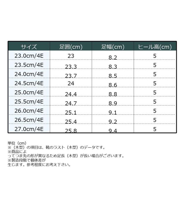材質=合成皮革 底材=合成底 ヒール=約5cm ワイズ=4E 重量=約250g(4E:24.5cm片足) ※生産時期や素材などによって多少個体差があります。 かかとにジェル状パッド付 防水仕様(約4cm、8時間)※完全防水ではありませんが水が浸み込みにくい素材を使用しております。構造上防水加工出来ない部分からの水の侵入は避けられません。 原産国:中国製 備考:単位(cm) ※(木型)の項目は、靴のラスト(木型)のデータです。 ※商品によってつま先の形が異なるため足長(木型)が長い場合がございます。 ※製造段階で個体差が生じます。参考程度にお考え下さい。