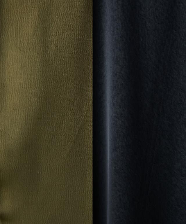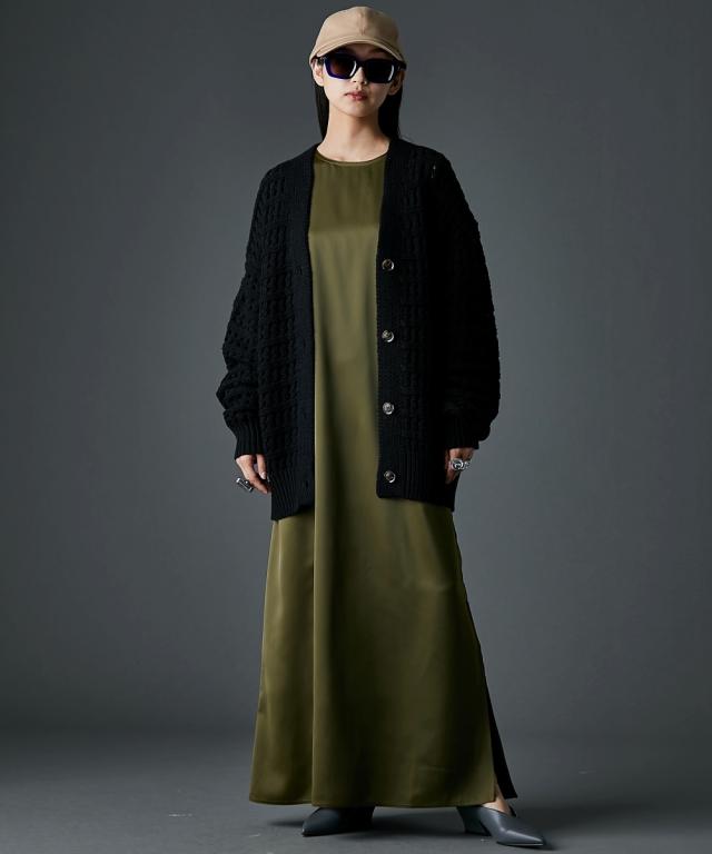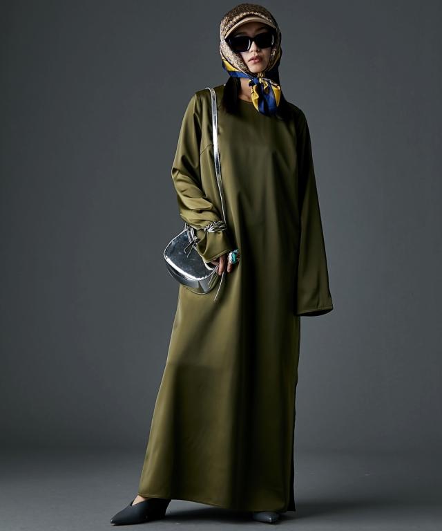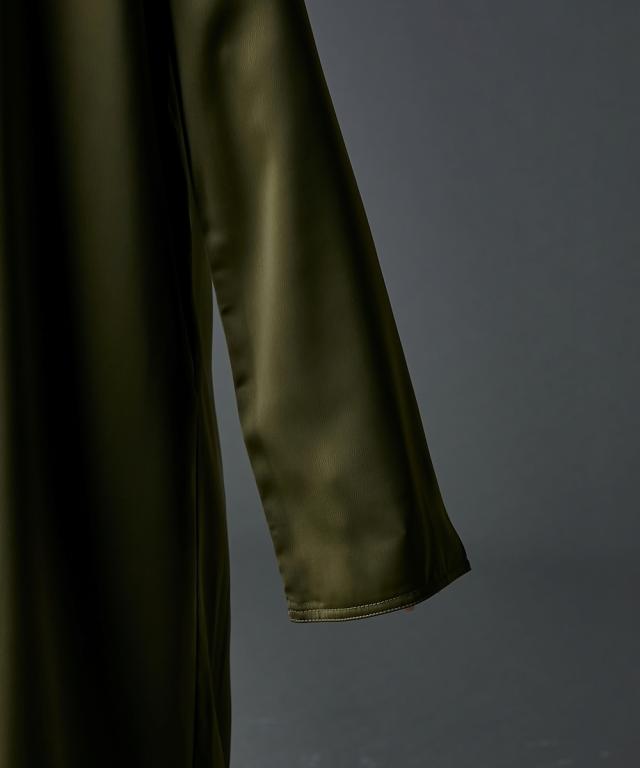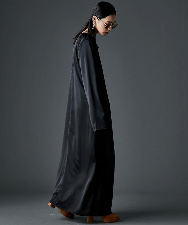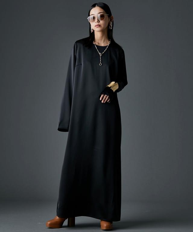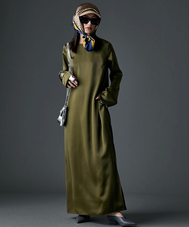 光沢がきれいなサテンマキシワンピース。■デザインつまり気味のネックラインとたっぷりとした袖丈がミニマルながらもモードな雰囲気を醸し出します。ストンと落ちるIラインシルエットは体のラインを拾いすぎず、体型カバーも可能。左裾には長めのスリットがあるので足さばきも良く、程よい抜け感も出ます。■素材落ち感があり滑らかなサテン生地を使用。■おすすめのスタイリング1枚でさらっと着ていただけます。肌寒くなる時期にはニットカーディガンやアノラック等を羽織っていただいてもステキです。