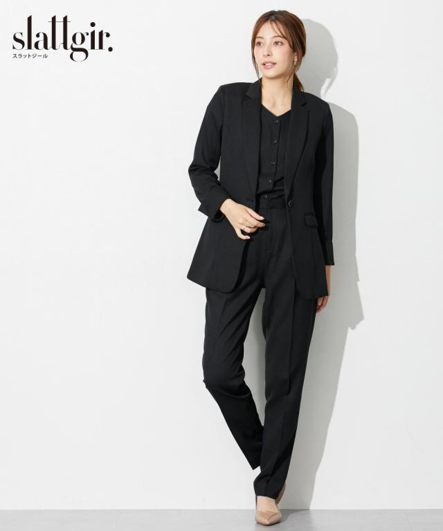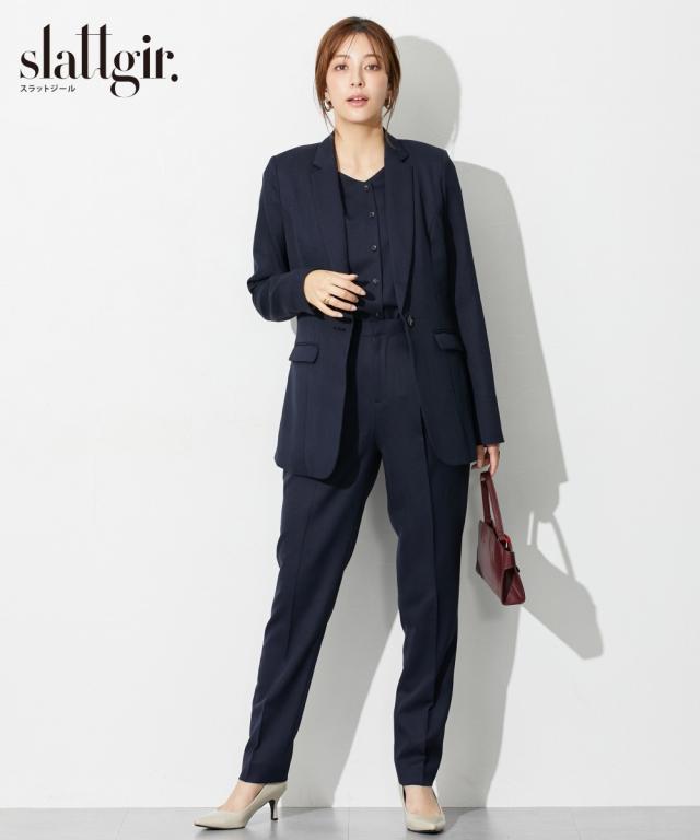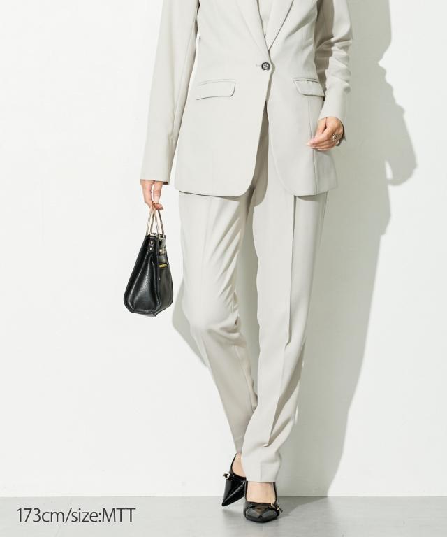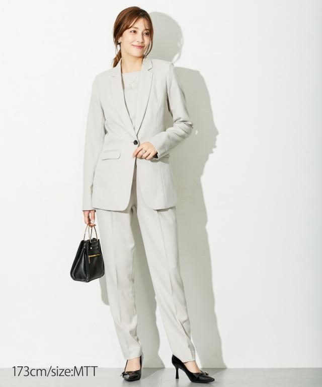高身長 【レディーススーツ】ドビー素材セットアップテーパードパンツスーツ3点セット(ロング丈テーラードジャケット+2WAYブラウス+パンツ)(トールサイズ)