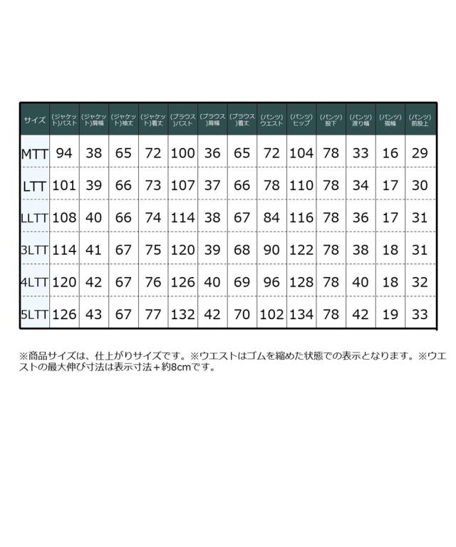 品質:ポリエステル100% 【ジャケット】[裏地]有(背抜き)肩パッド有 前ボタン開き 袖口スリット ポケット前2つ・内1つ 【ブラウス】[裏地]無 前ボタン開き 【パンツ】[裏地]無 前ファスナー内ボタン開き ウエスト後ゴム入 ポケット両脇・後飾りポケット 透け感:なし 伸縮性:なし 生地の厚み:普通 光沢感:微光沢感あり 季節:春・夏・秋・冬向き ※この商品はジャケット・ブラウス・パンツの3点同サイズのみで販売します。 原産国:中国製 備考:洗濯機OK ネット使用 ※商品サイズは、仕上がりサイズです。※ウエストはゴムを縮めた状態での表示となります。※ウエストの最大伸び寸法は表示寸法+約8cmです。