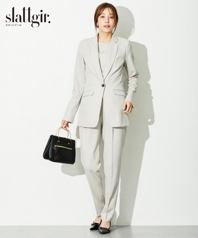 高身長 【レディーススーツ】ドビー素材セットアップテーパードパンツスーツ3点セット(ロング丈テーラードジャケット+2WAYブラウス+パンツ)(トールサイズ)