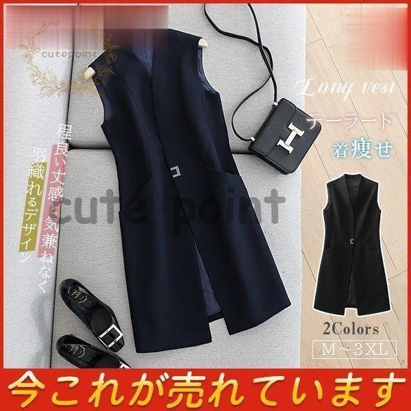 テーラード レディース ジレベスト 着痩せ チュニック シンプル Vネック ロングベスト 無地 ポケット付き ノースリーブ 前開きベスト
