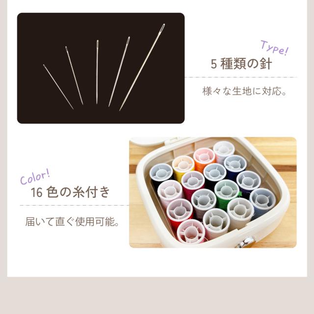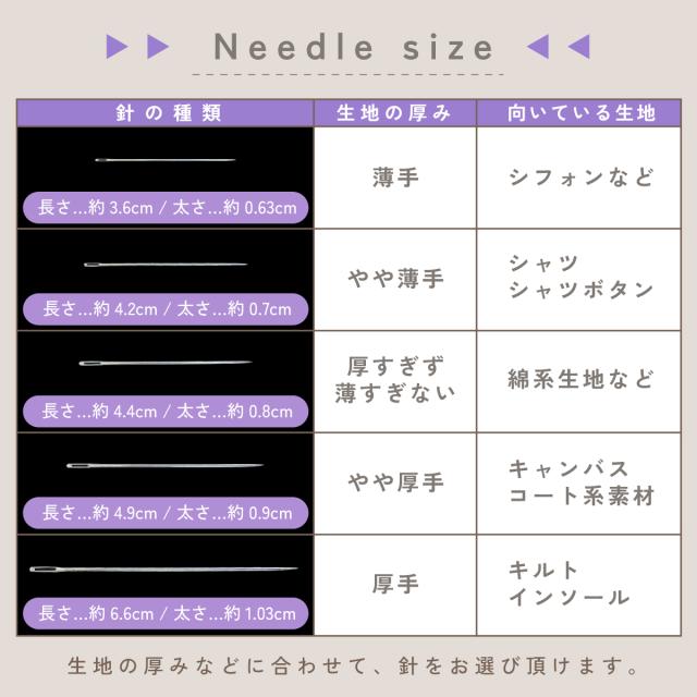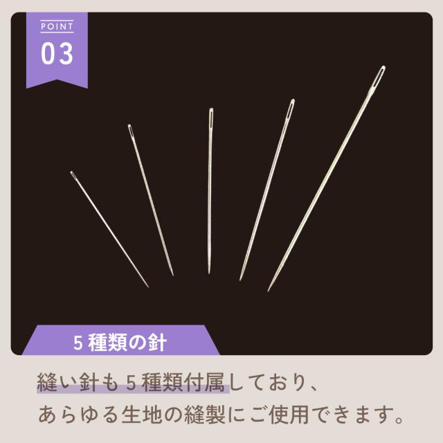 縫い針も5種類付属しており、あらゆる生地の裁縫にご使用できます。