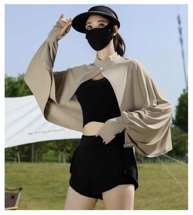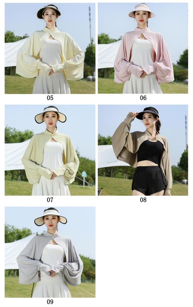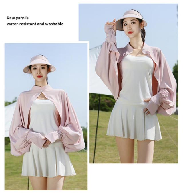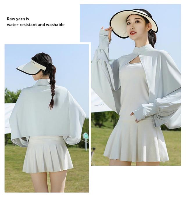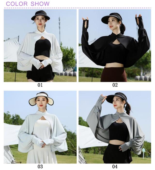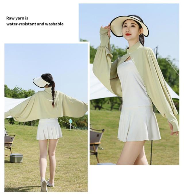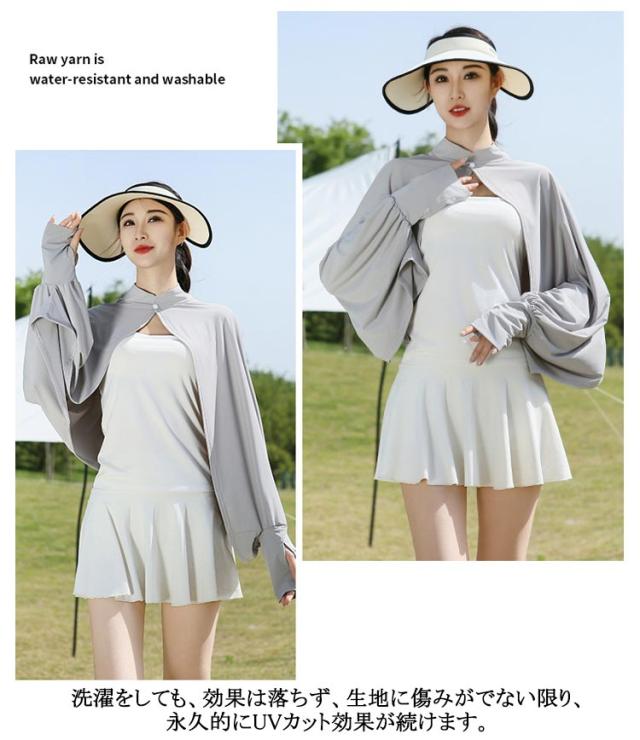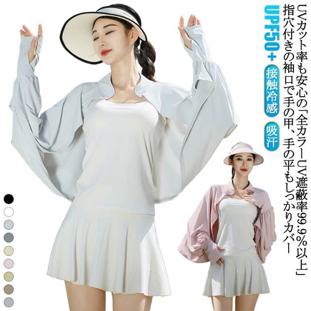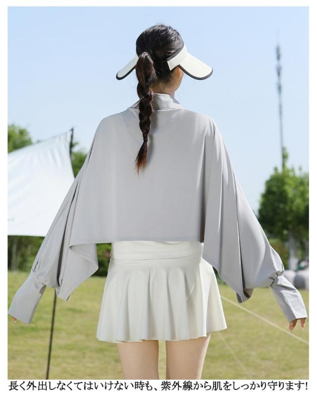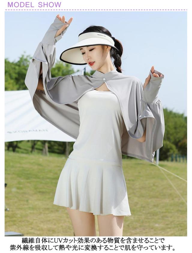 立ち襟 UVカット ケープ マント 冷感 ポンチョ UPF50+ レディース 可愛い UV パーカー ラッシュガード 長袖 ライトアウター ショート丈 ゆったり 日よけ カーディガン アームカバー 着る 指穴 ボタン トップス 体型カバー ボレロ 送料無料
