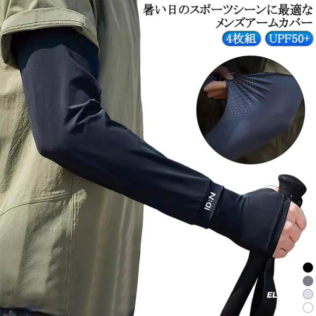 4枚セット メンズ アームカバー 指穴 UV 日焼け対策 UPF50+ 接触冷感 アームカバー ロング 男用 大きいサイズ 冷感アームカバー スポーツ 自転車 ゴルフ 野球 アウトドア 紫外線対策 UVカット ズレ落ち防止 滑り止め 軽量 薄手