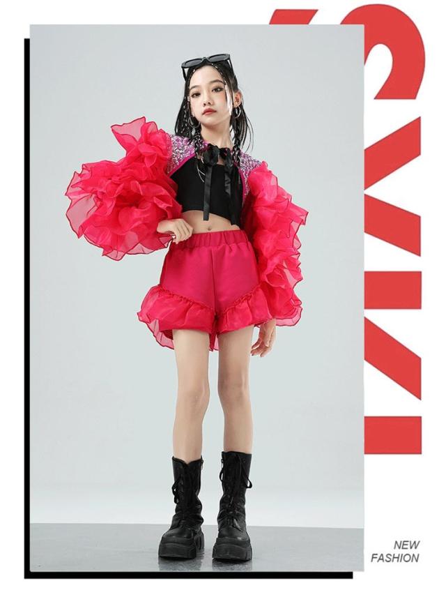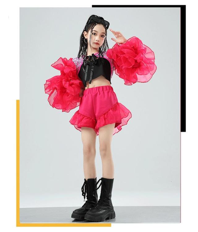 子供用 キッズ ダンス衣装 ジャズ トップス セットアップ ヒップホップ キャミソール 女の子 ダンス服 ショット丈 黒 へそ出し フリル ショットパンツ ダンス ボリューム 目立つ 衣装 ジュニア ダンス 発表会 派手 HIPHOP 舞台