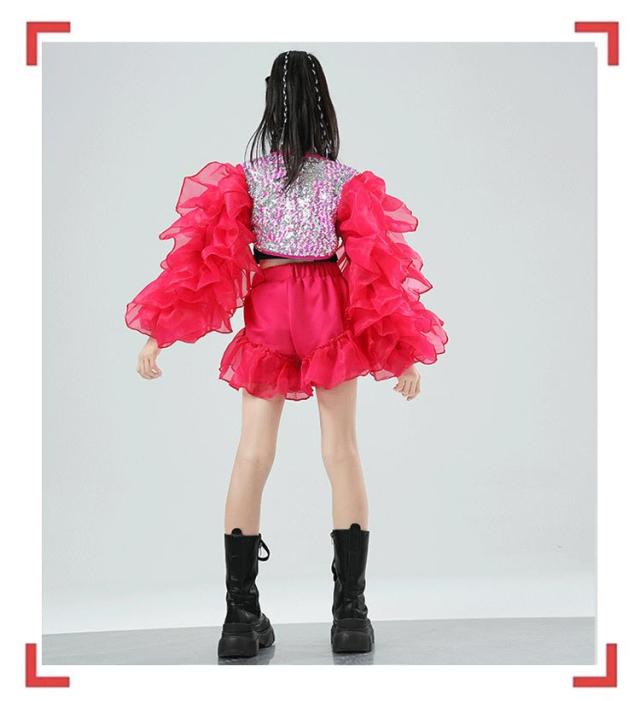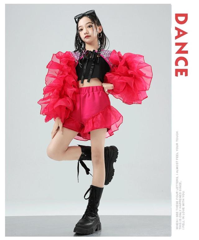 | 女の子向けのガールズデザインで、へそ出しでかわいいです。 個性的で派手かわいいキッズのダンス衣装。 発表会や応援団、イベントに最適な演出服です。 ジャズやK-POP、y2kダンスなど、さまざまなスタイルに対応します。 | |