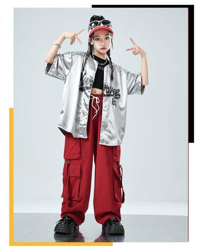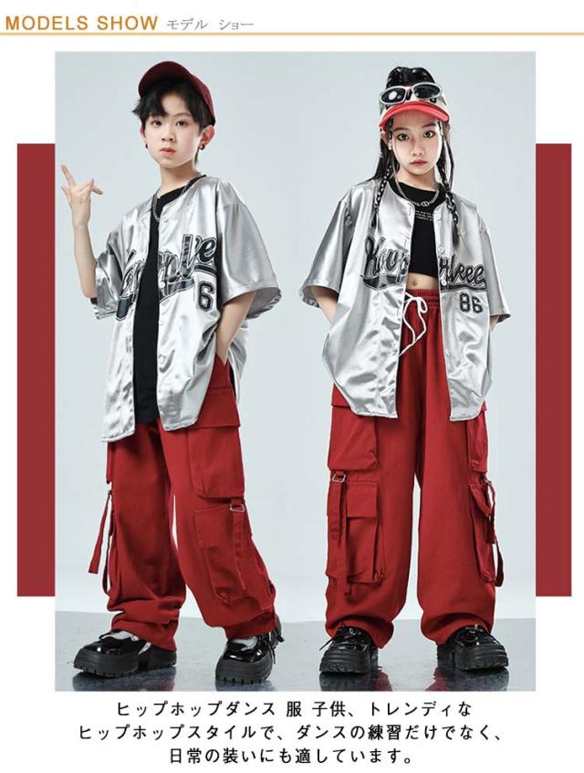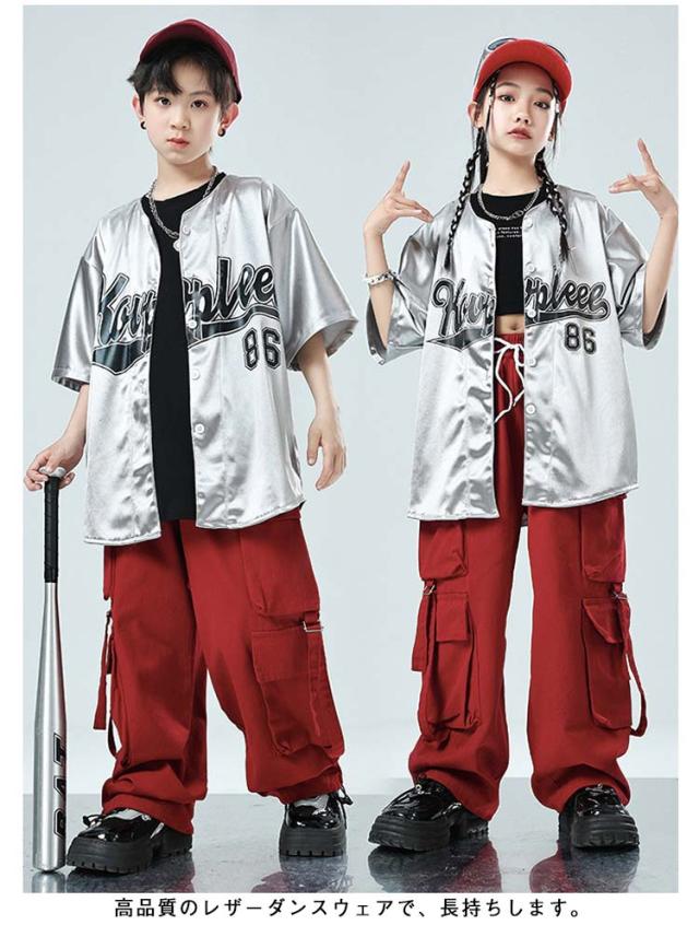 キッズ ダンス ベースボールシャツ 赤 シルバー シャツ ヒップホップ 女の子 団体服 子供服 衣装 キッズ 男の子 キッズダンス衣装 シャツ カジュアル 子ども服 k-pop セットアップ 練習着 ダンス衣装 応援団 ベースボールシャツ イベント カーゴパンツ
