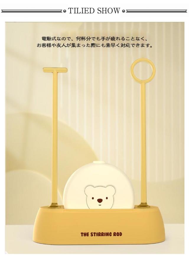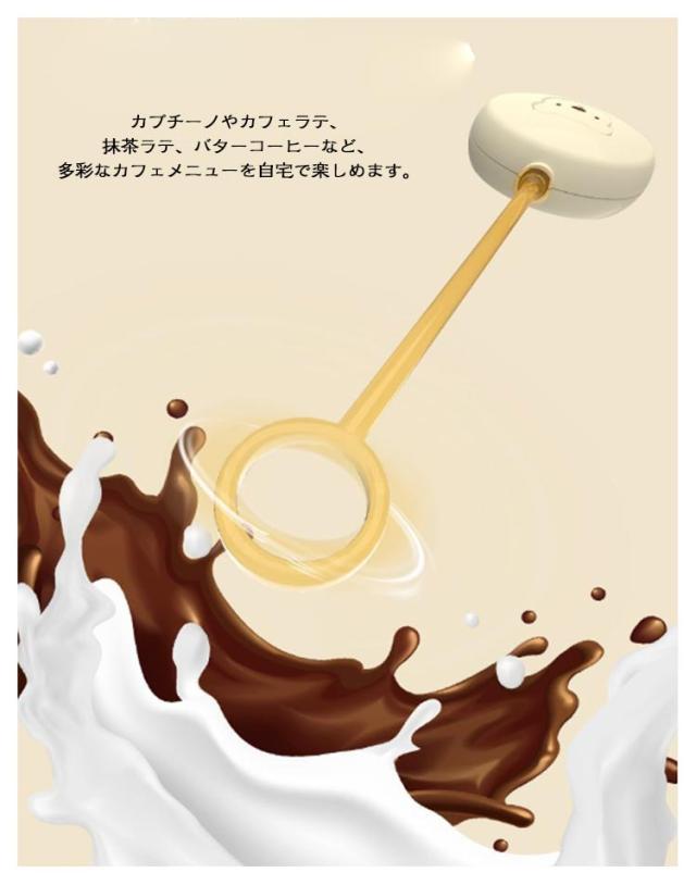 | 力強くスムーズな回転で、粉ミルク、青汁など、様々なドリンクをかき混ぜ可能。 電動式なので、何杯分でも手が疲れることなく、お客様や友人が集まった際にも素早く対応できます。 手に負担がかかりにくく、持ち運びや収納も簡単です。 カプチーノやカフェラテ、抹茶ラテ、バターコーヒーなど、多彩なカフェメニューを自宅で楽しめます。 もちろん、ミルクのかき混ぜだけでなく、生クリームや卵、離乳食の攪拌にもお使いいただけます。 | |