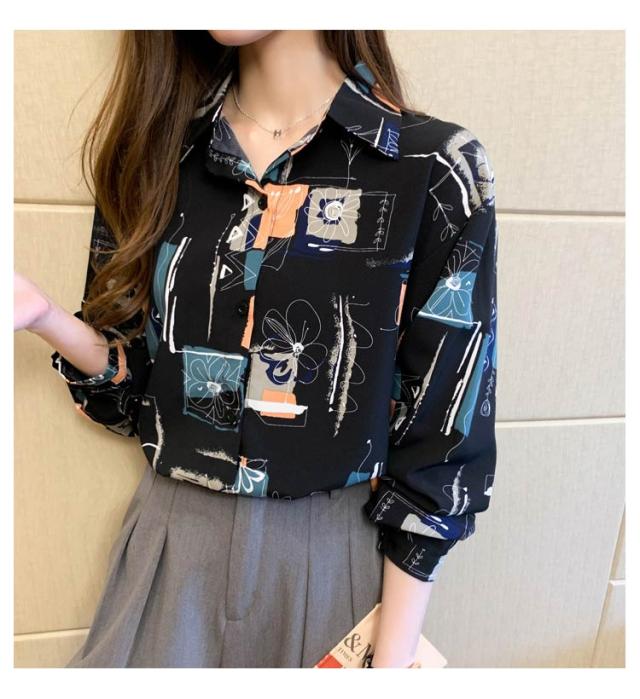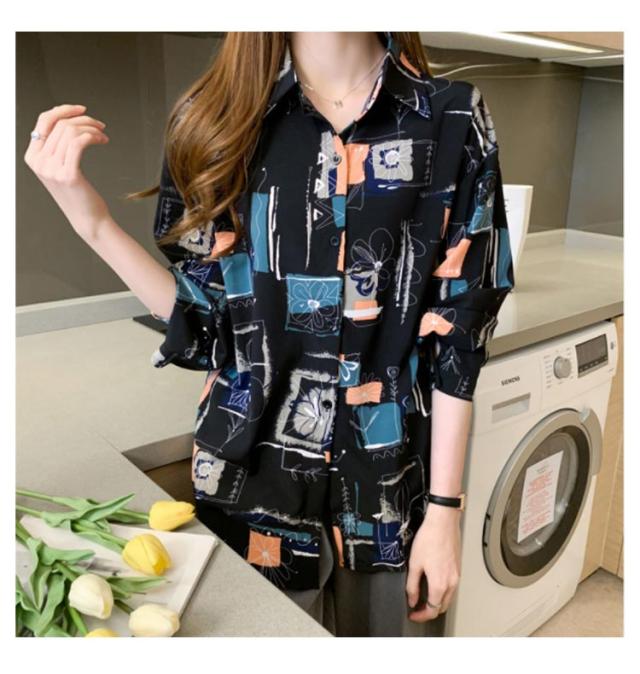 長袖シャツ アロハシャツ 柄シャツ チュニック 長袖 ブラウス 体型カバー トップス 開襟シャツ プリントシャツ レディース ロングシャツ レイヤード オーバーサイズ 総柄 水彩 柄 長袖 羽織 大きいサイズ ブラック