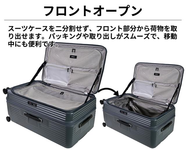 狭い場所でもフロントから荷物の出し入れができるユニークなフロントオープン機能と、拡張ファスナー付きで旅行先で荷物が増えても安心です。